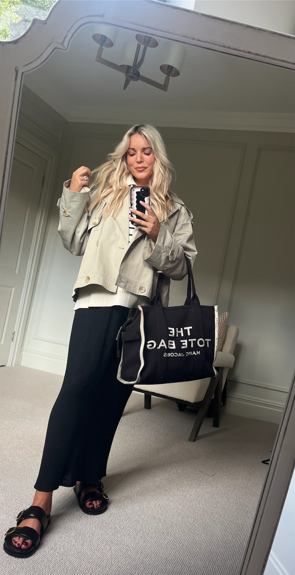 This outfit is honestly as comfortable as a tracksuit but is just a more elevated version! Building a work wardrobe around a neutral colour palette ensures no daily tantrums of having nothing to wear. Good neutral staples will always help you feel put together with minimum effort. A knitted skirt is a pregnant woman’s best friend! I love this one from Meshki. My striped pullover is from Zara, my short trench coat is from NA-KD, my sandals are from Massimo Dutti and my bag is by Marc Jacobs.