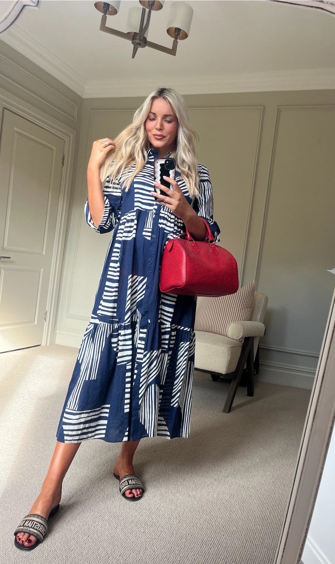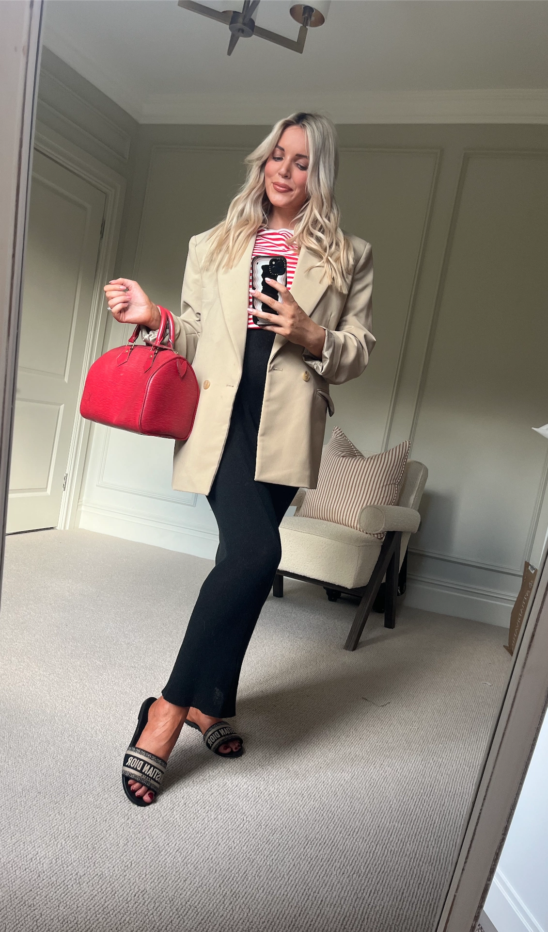 This polo-style knit dress is a simple and comfortable style that is super bump-friendly. I like the slit detail for added interest. My whole style mantra throughout my pregnancy has been ‘more bumpy, less frumpy’. For me, it feels very dated to feel the need to cover up the bump, both in professional and social environments. I think perhaps women in the workplace feared the opinions of men or the hierarchy if they were seen to be looking “too pregnant” but I am all about embracing the bump – it’s not an accessory, it’s my body and I think it is bloody amazing! Pre-pregnancy, I would have leaned more towards fitted fashion so I didn’t want to lose sight of my style altogether. Knitted dresses are flattering and comfortable and still make you feel nice and glam for brunch with the girls. I love The Frankie Shop for their tailoring – I have about seven of their blazers now and they are the perfect shape and length. I love this lightweight long-line style for late summer. These Dior slides were worth every penny, so comfy and go with everything! My bag is the YSL wallet bag.