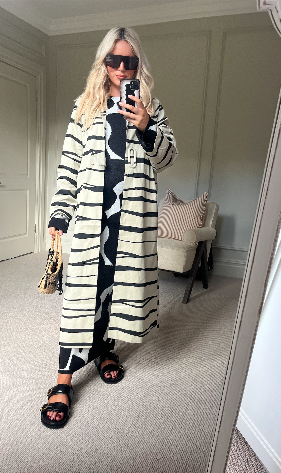 This gives me on-the-go PR girl vibes! This knitted dress is possibly my favourite buy all year. NA-KD is a super retailer – like a Swedish ASOS but better! Everything is well-priced and they have some really unique styles that give me Copenhagen Fashion Week vibes. I like to have fun with fashion every chance I guess, and this dress is a really fun and striking print but still super easy to style. These Massimo Dutti buckle sandals are like slippers so are great for running around town for meetings, and my Arket basket bag is a really comfortable wear, the perfect size for a laptop, my make-up bag and any other essentials. I also love to print clash! This striped trench is another killer piece from NA-KD that works so well with jeans and a white tee too.