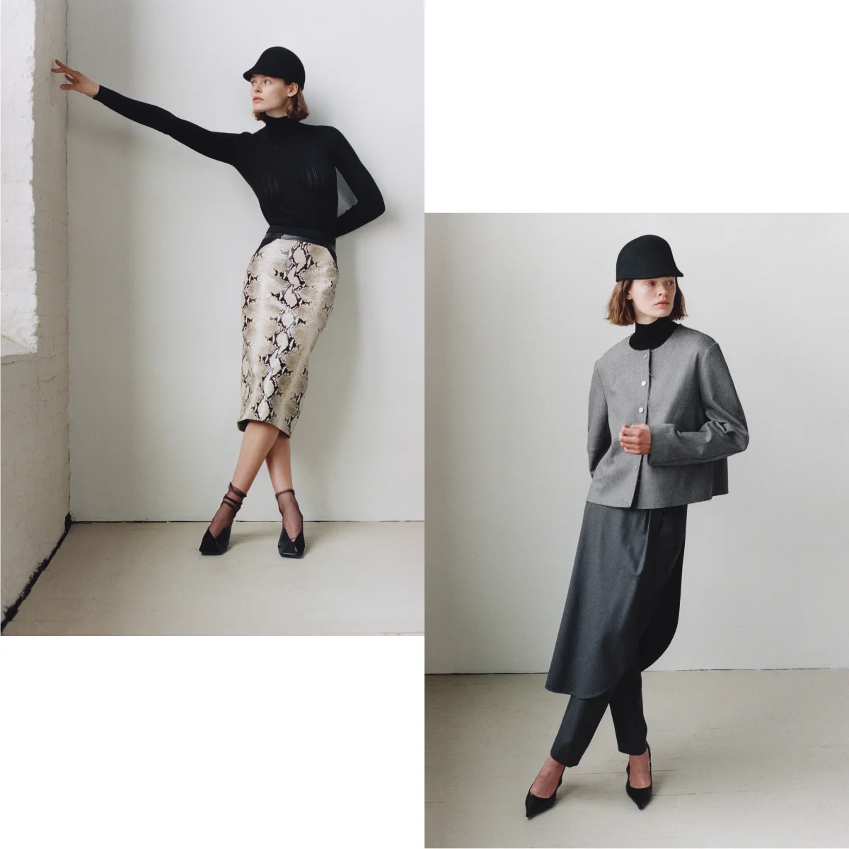 We are also continuing to develop and explore closed-loop fabrics. The NAIA Renew silk-like sateen used in the voluminous gathered skirt, the scarf scoop dress, and the wrap skirt trouser is derived from 60% sustainably sourced wood pulp and 40% certified recycled waste, produced in a system where water and solvents are recycled. We’re also excited to be including deadstock leather, in a beautiful python print, this season.