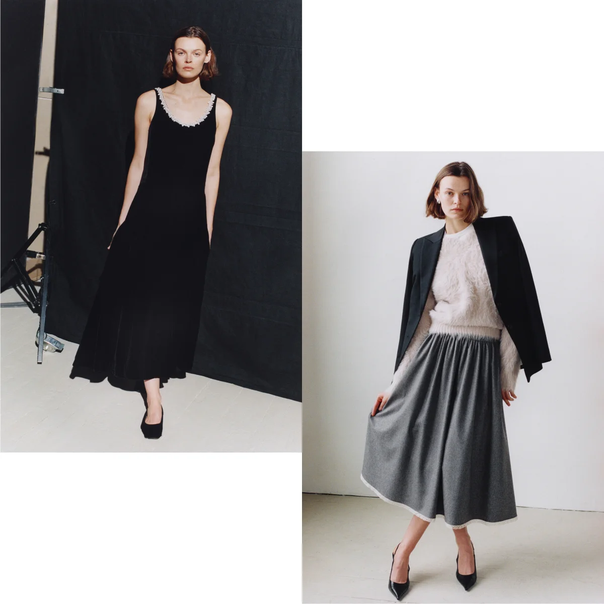 Velvet is a new addition this season, developed from Japanese FSC-certified viscose. It appears in a long black godet dress finished with a vintage georgette ribbon adorned with tiny white pearls, as well as in delicate lace-trimmed cami tops.