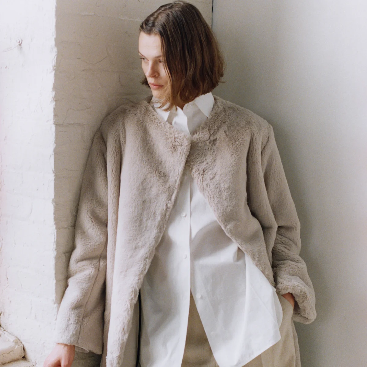 Recycled faux fur has a stronger presence this season, appearing in reversible coats, boleros, and sweaters, designed to extend versatility and wear. We’ve also expanded our use of an Italian recycled cashmere blended with organic cotton across reversible jerseys and coats.