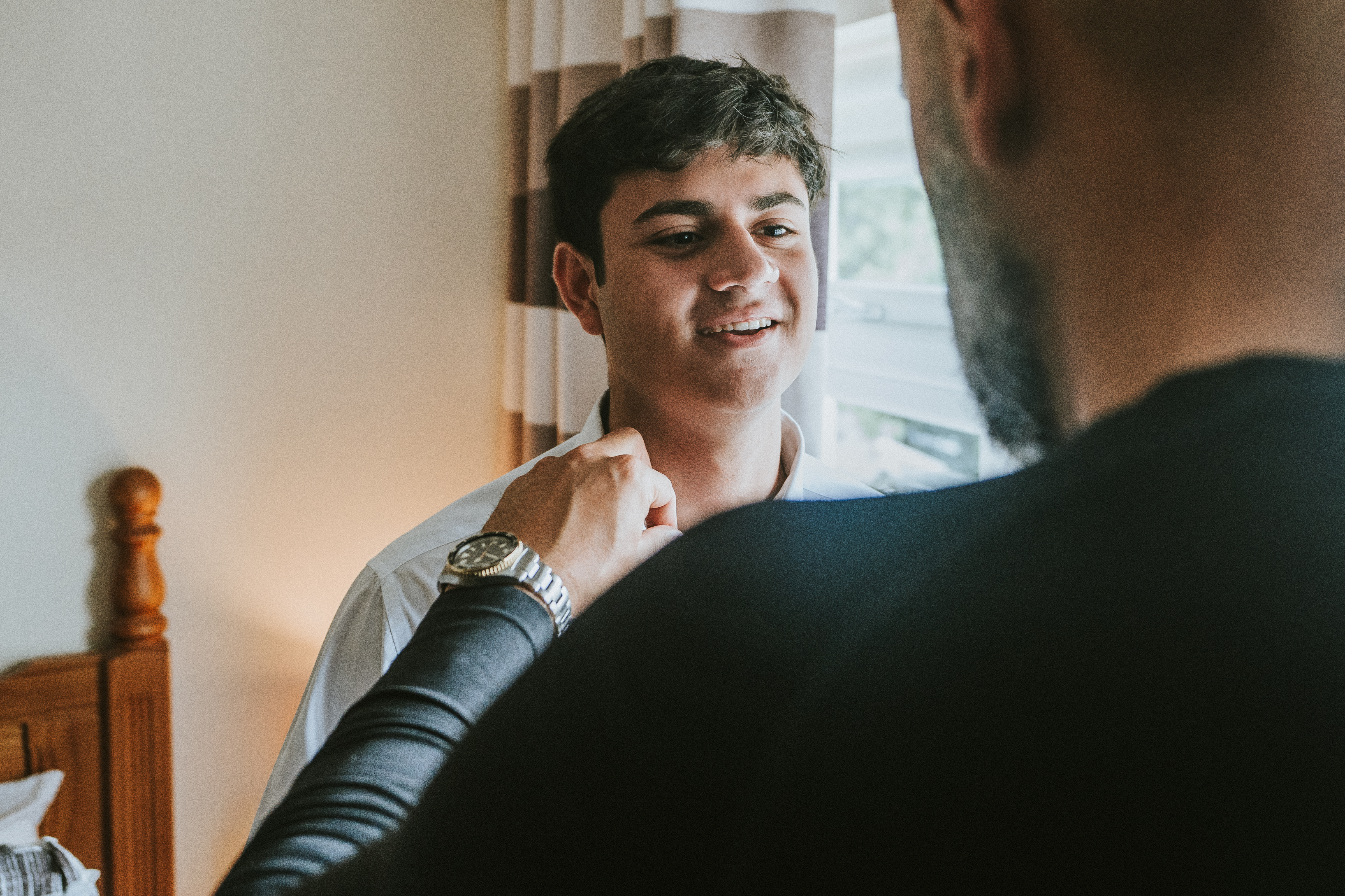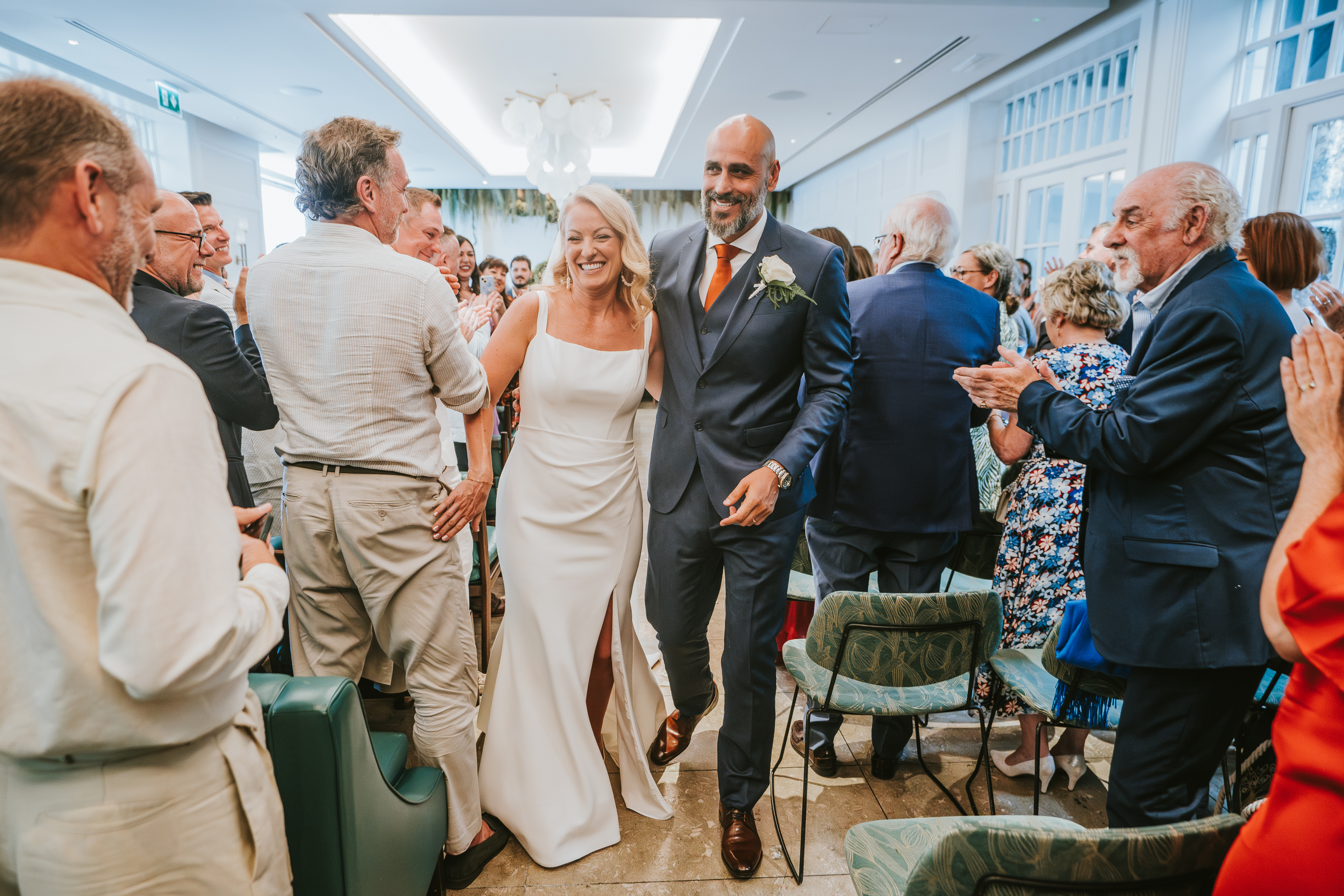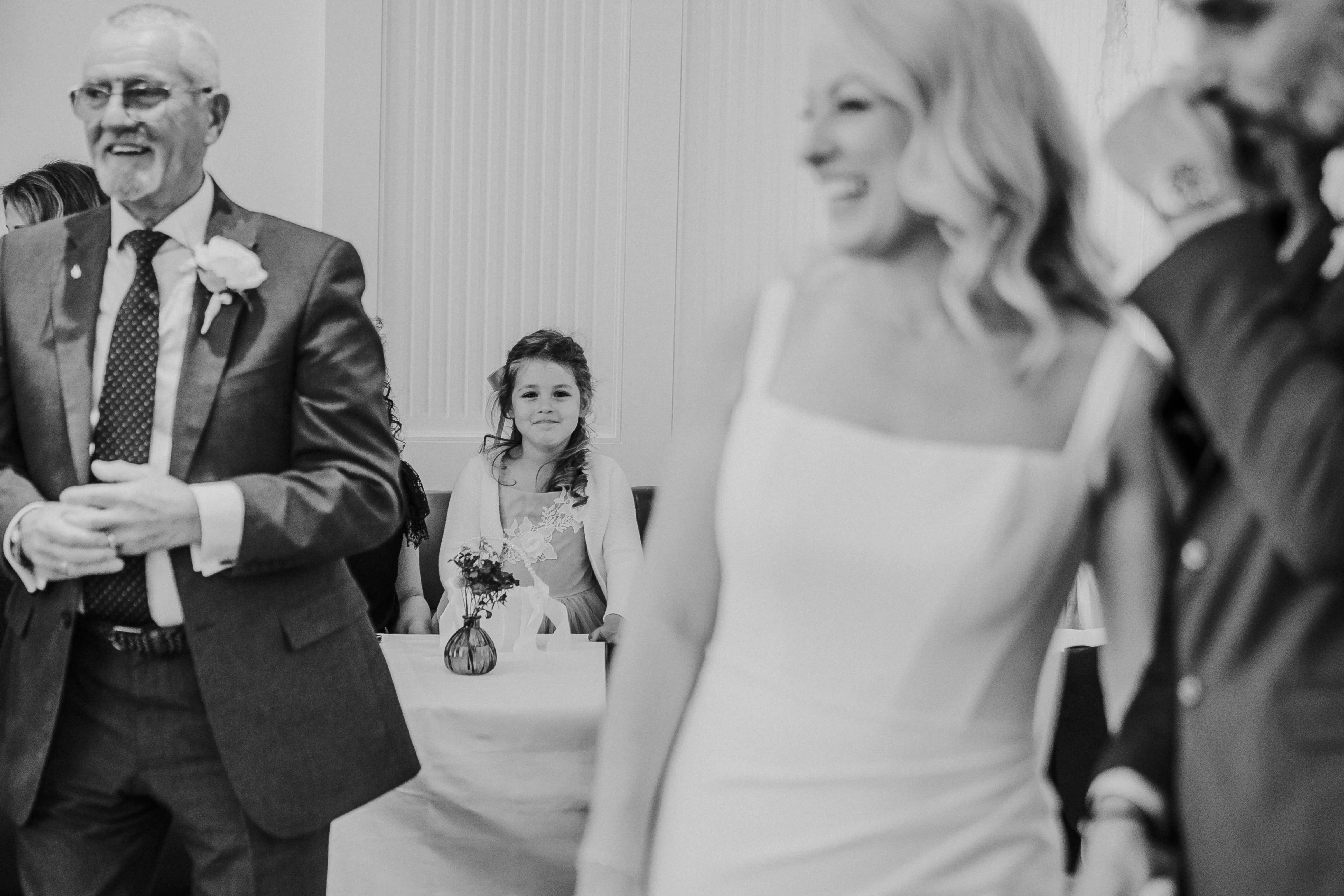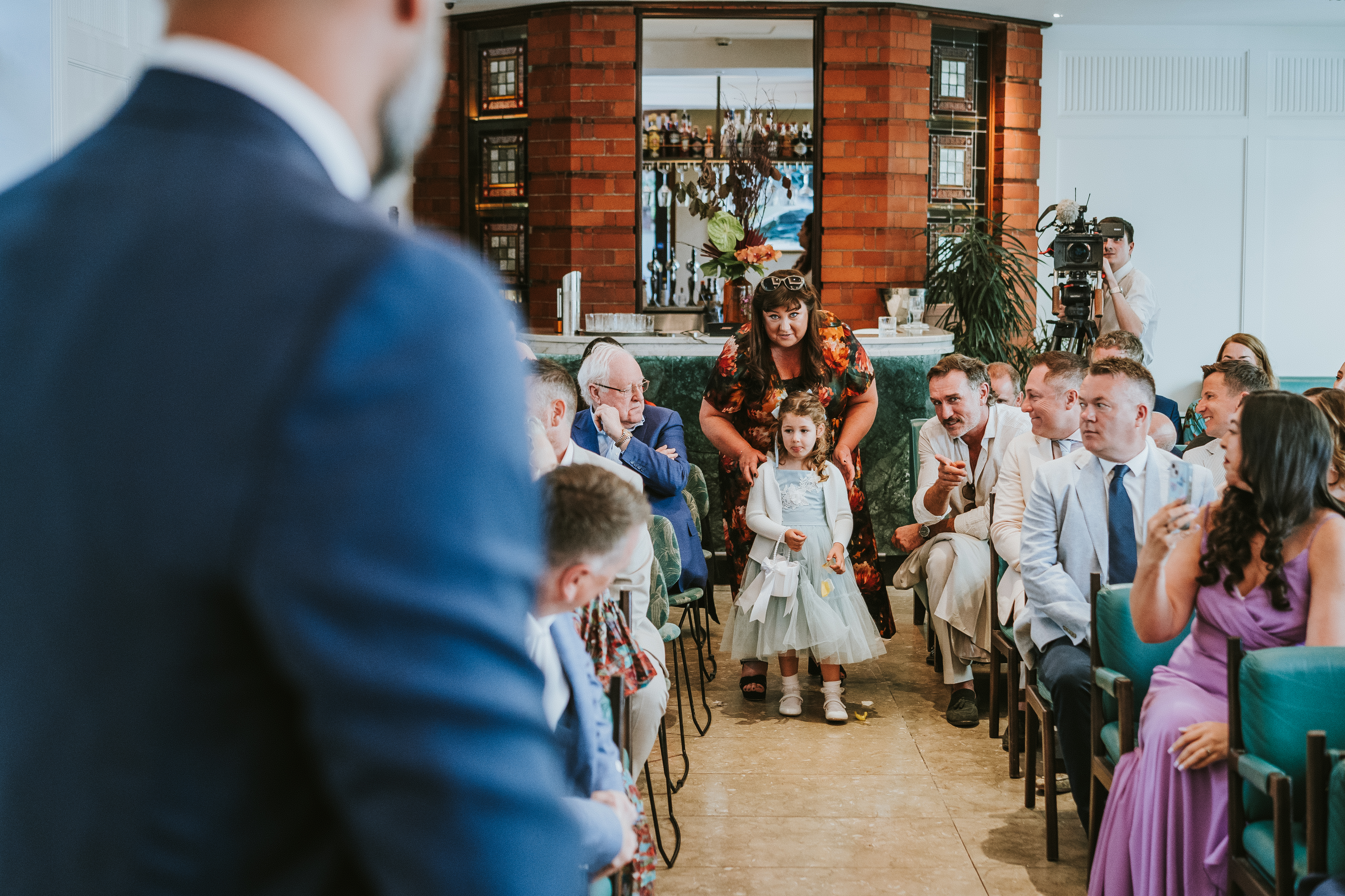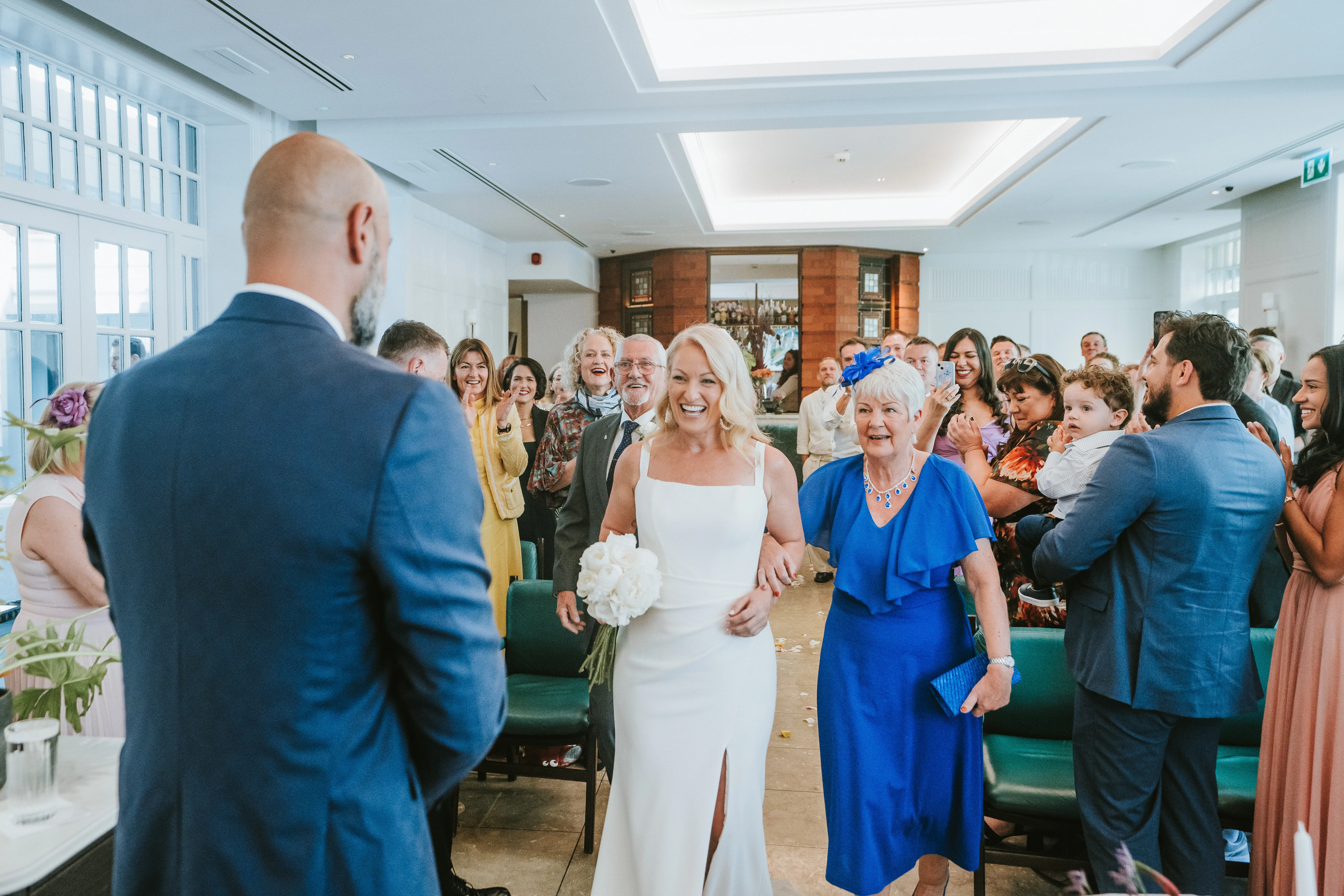 We both walked down the aisle in threes: Leo with his mam and his Aunt Luzia, and me with my mam and dad. Our celebrant was Emma Sides. We found her online; she was living close by and seemed like a good, experienced fit. We walked down the aisle to Only You by Yazoo.