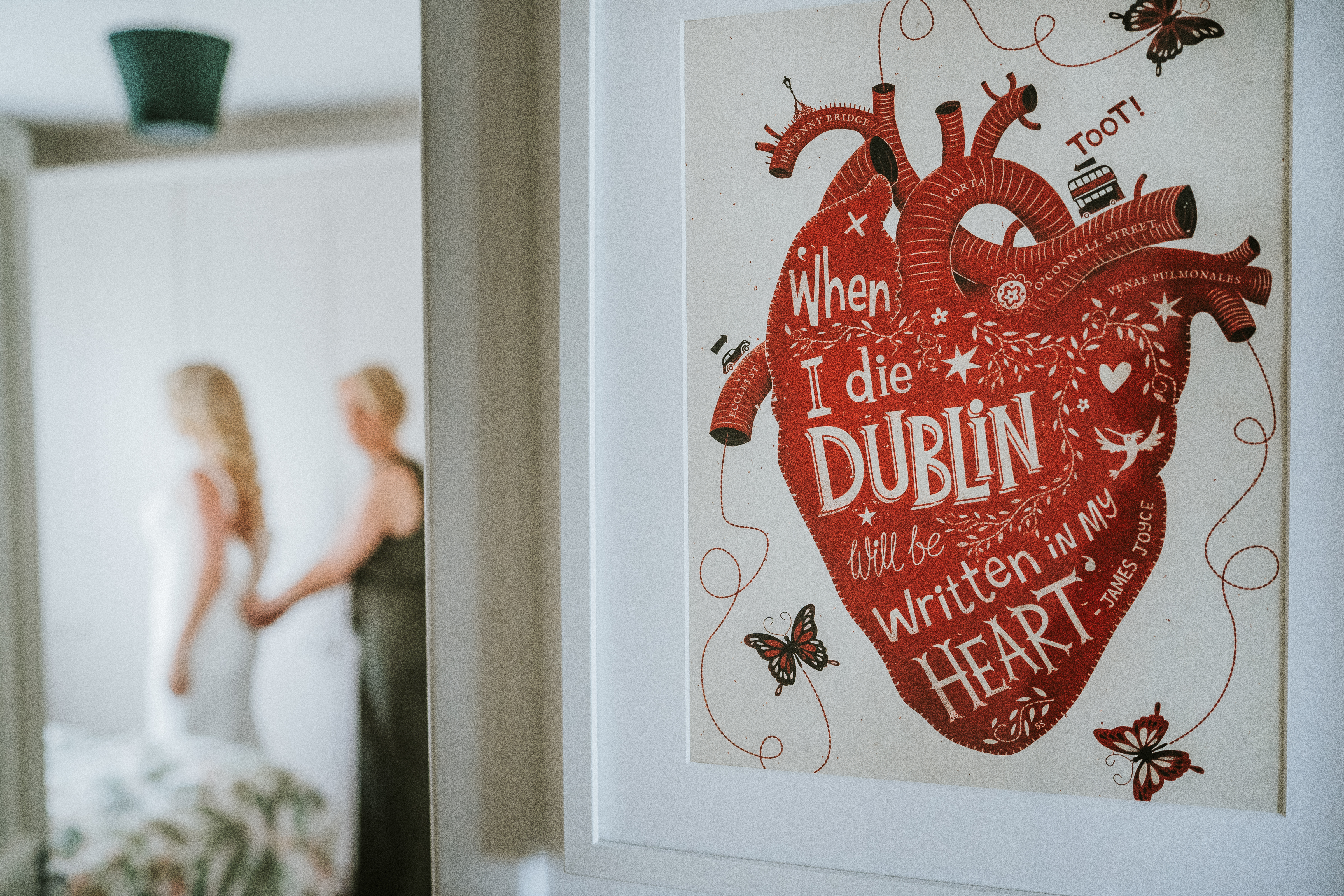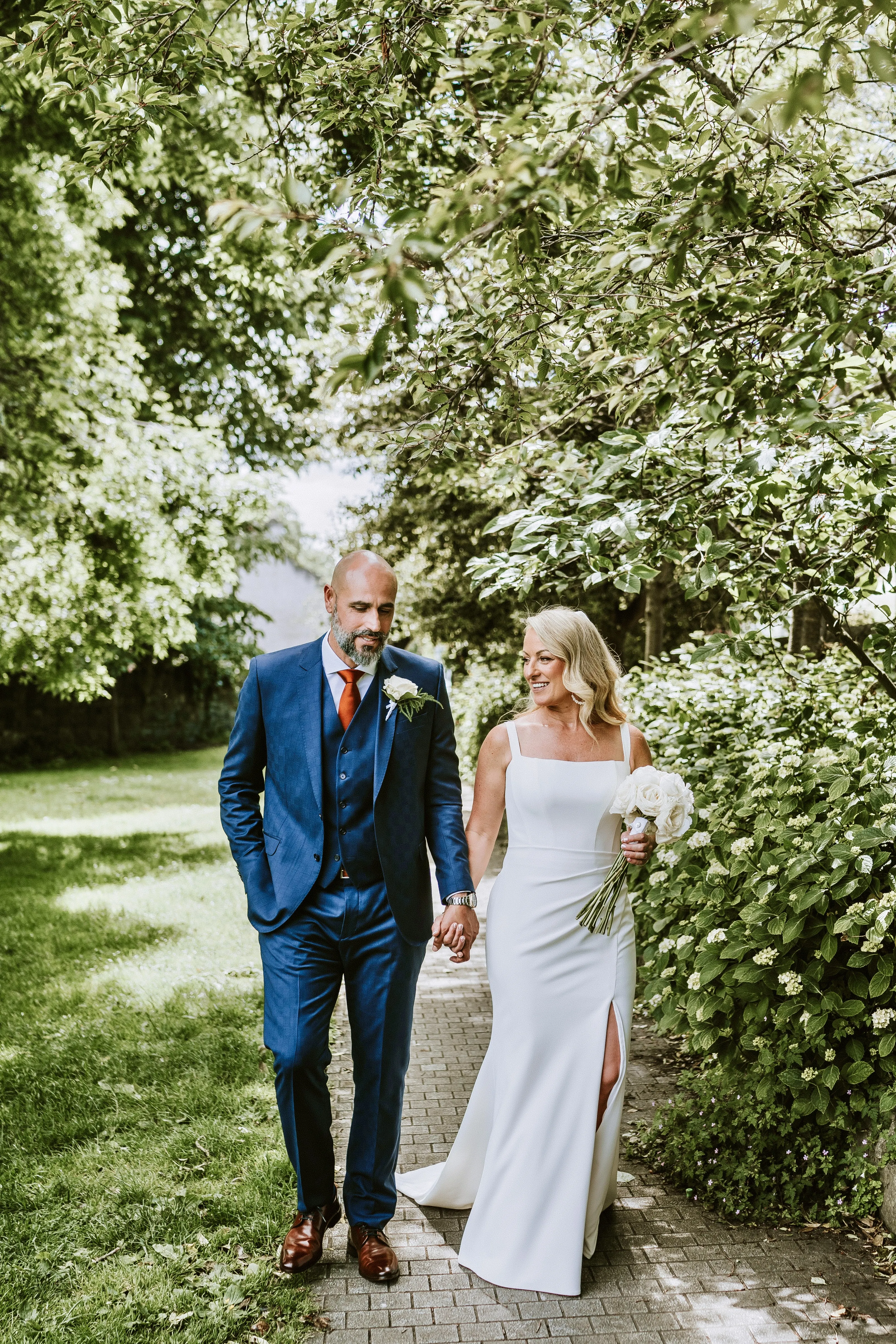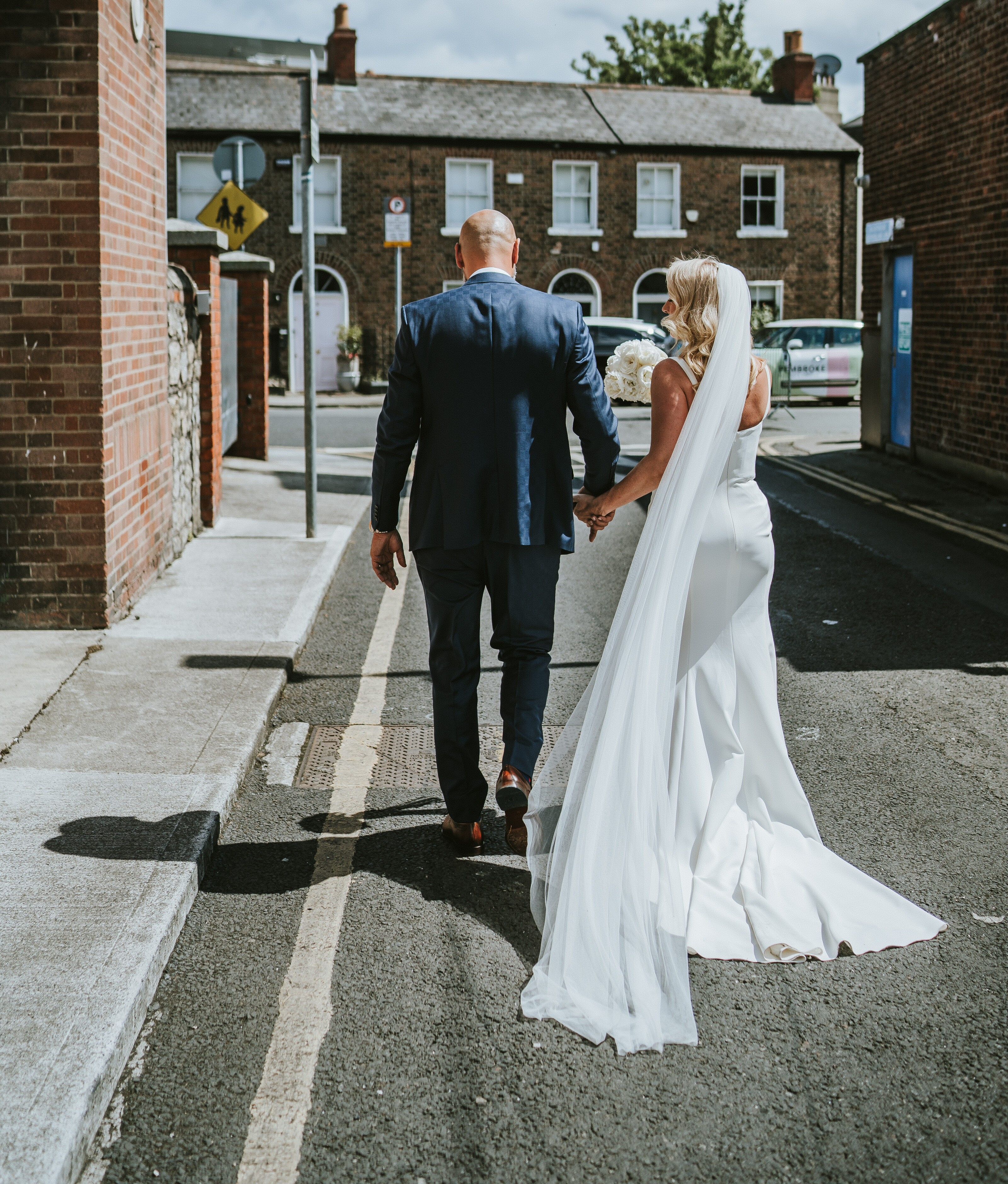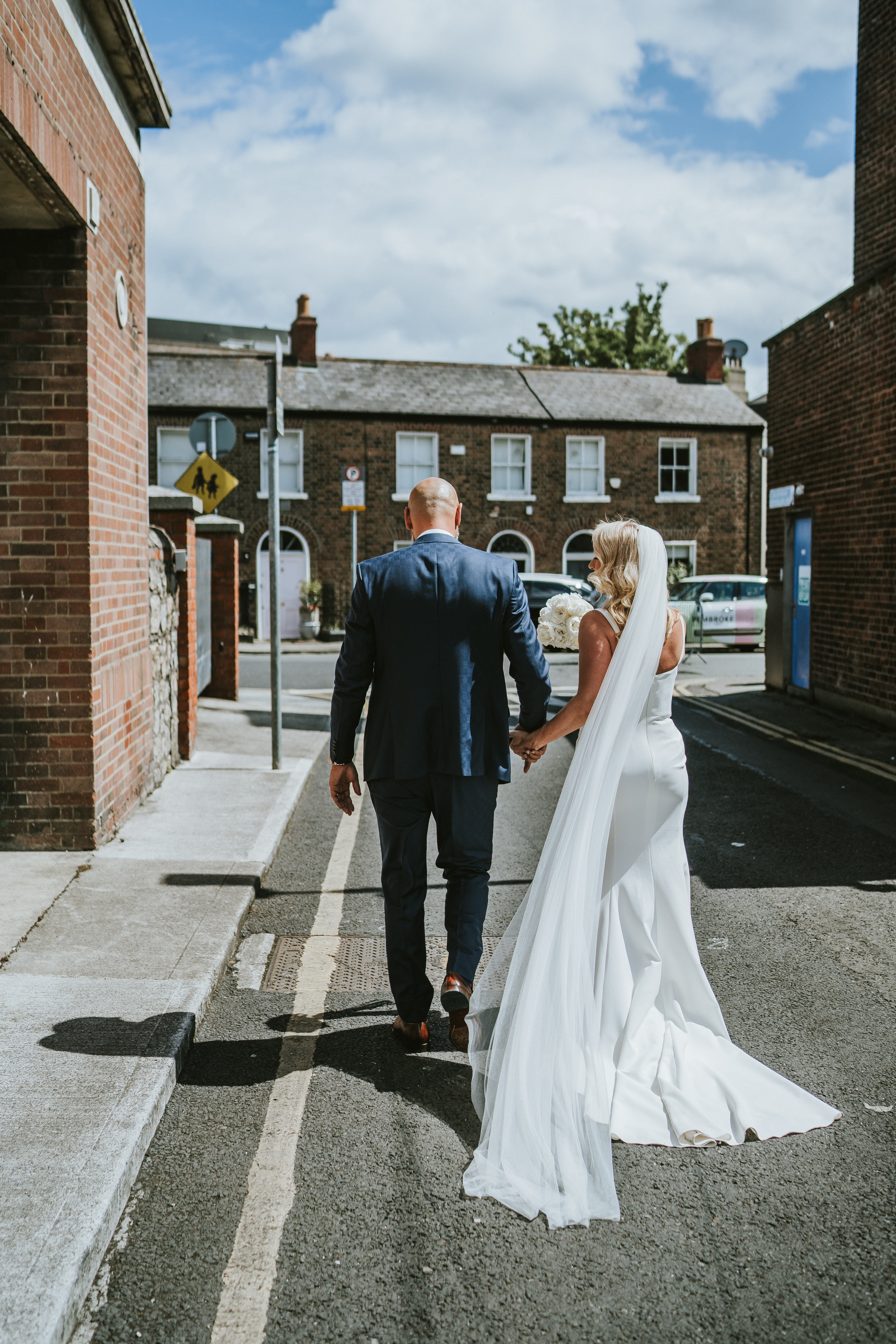 Bridal outfit: Ivory & Pearl. Groom’s suit: Made in Brazil. Florist: Ginkgo Florists. Hair: Kevin Hogan, The Company Hair Salon. Make-up: Dearbhla Keenan, Brown Sugar. Dress alterations: Aoife O’Broin. Videographer: Max Barry. Humanist Celebrant: Emma Sides. Custom-made earrings: One Dame Lane.