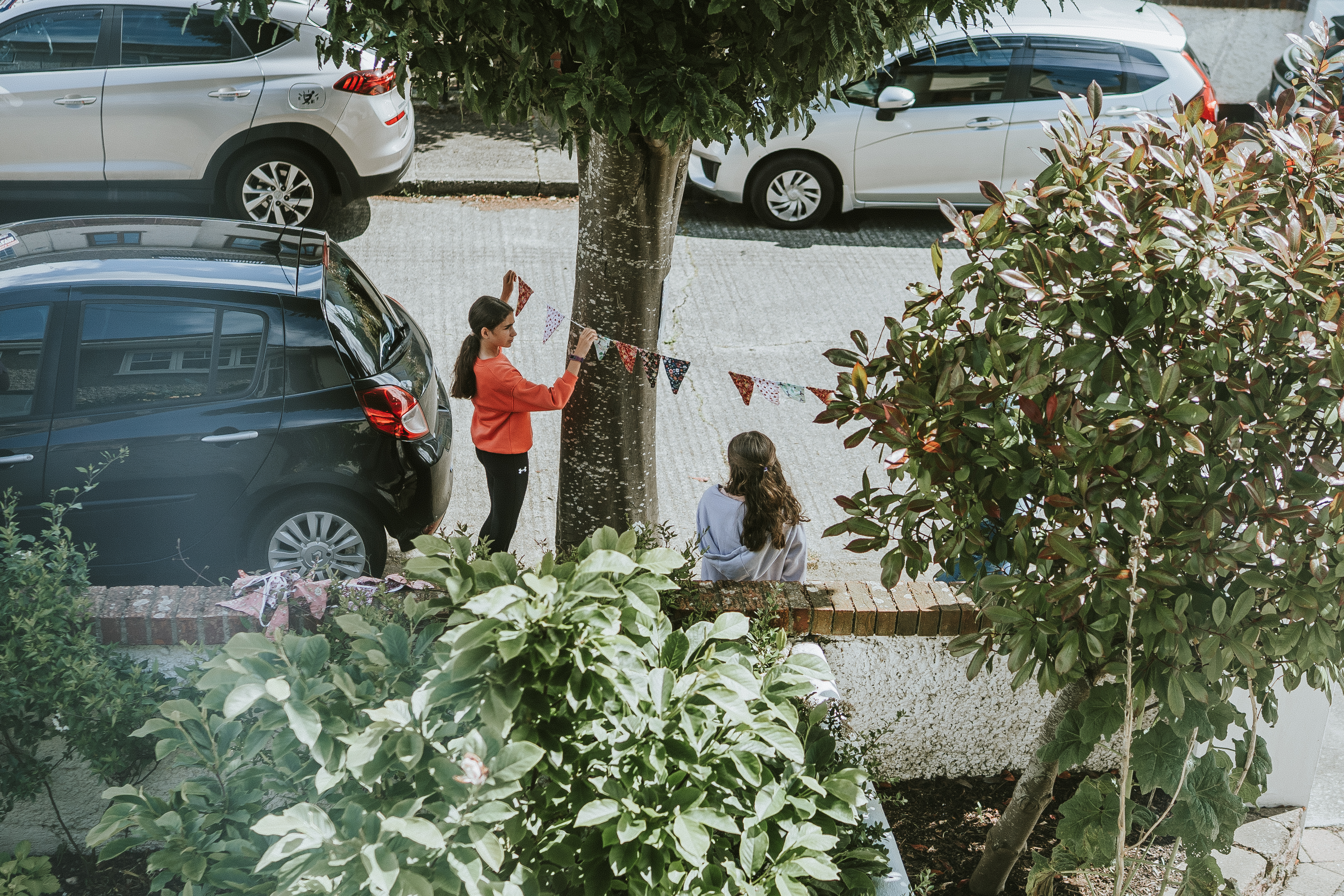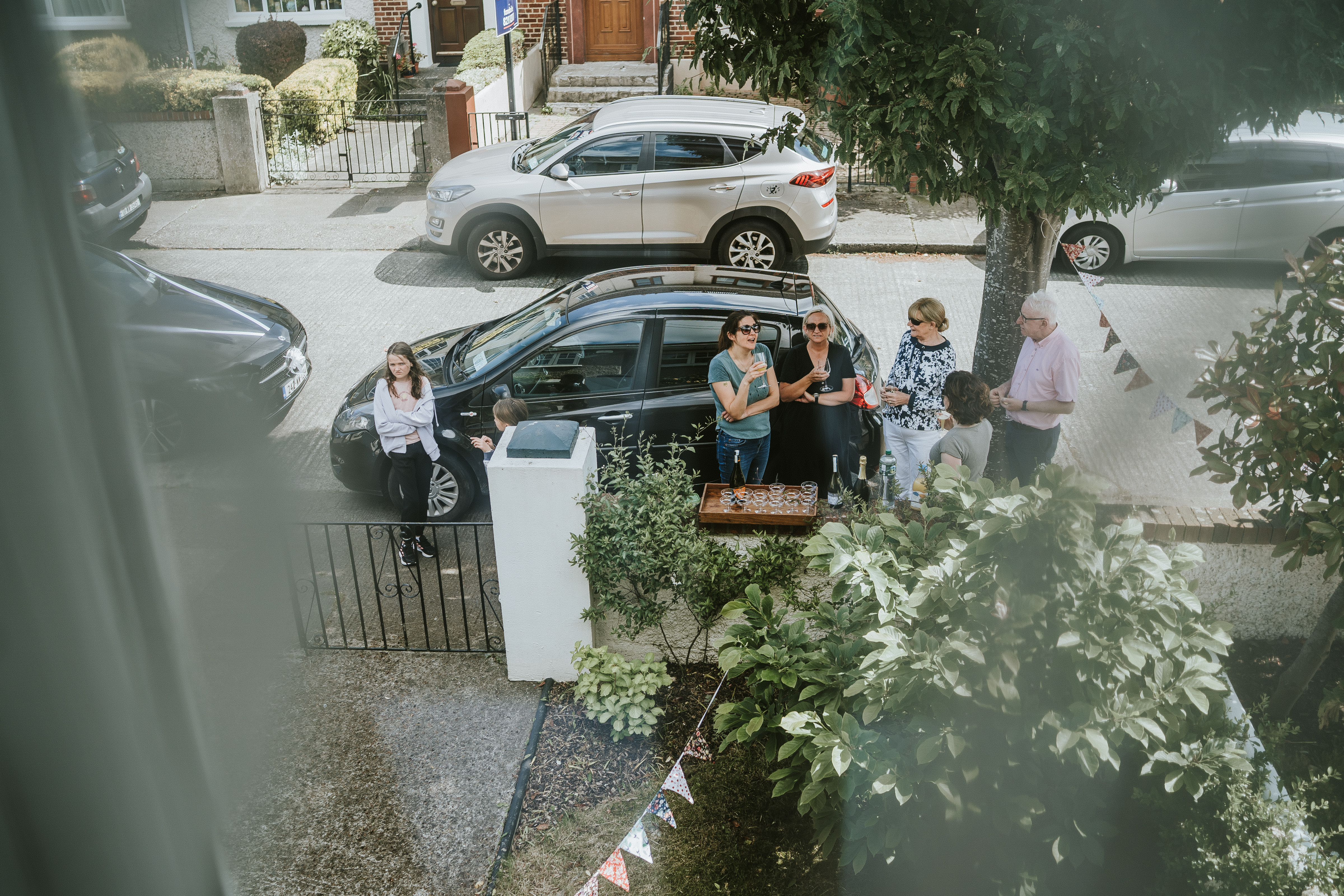- Our neighbours hanging bunting and assembling for drinks outside our house to send me on my way that morning.