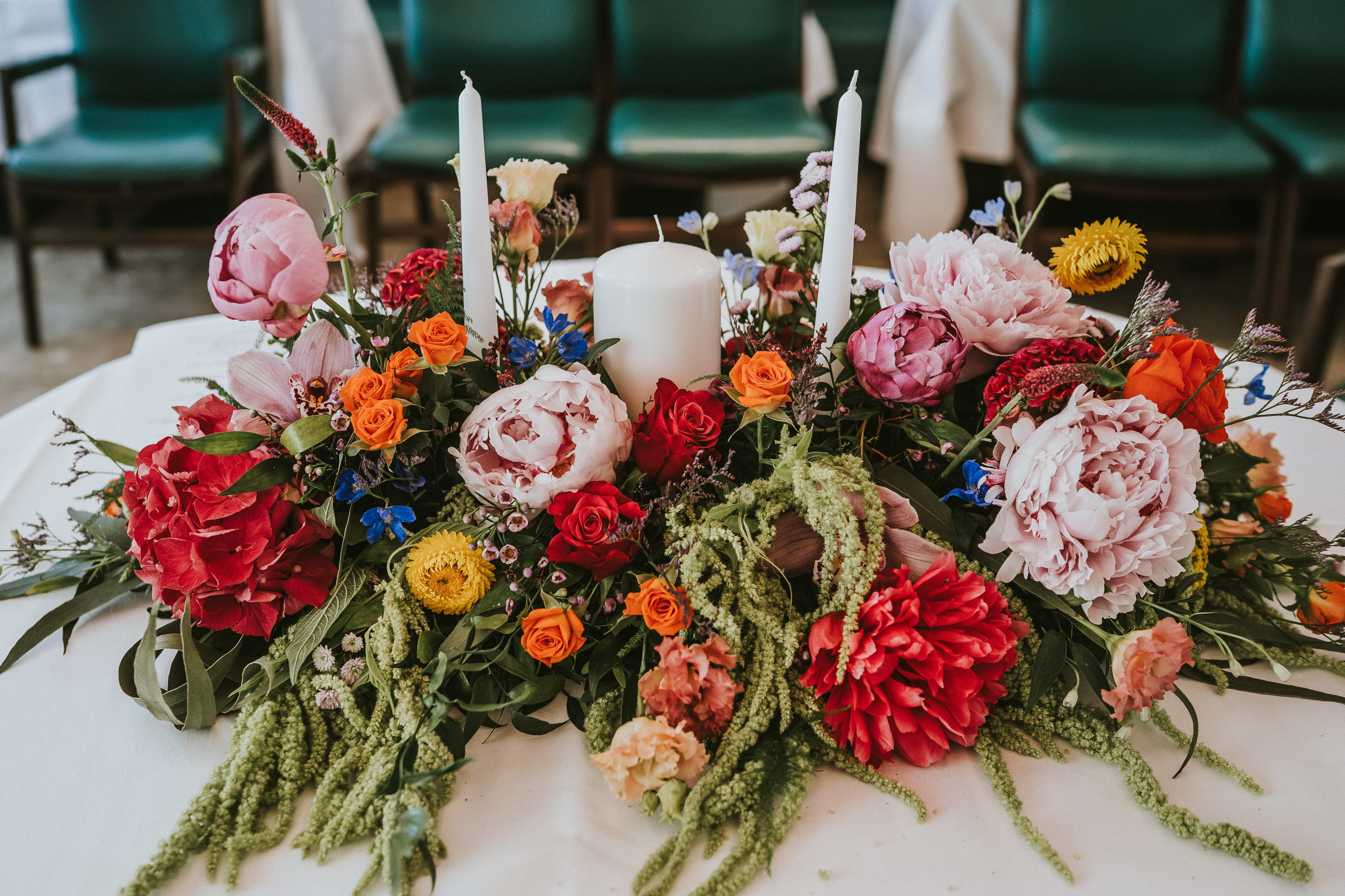 The hotel dining room, which was also used for the ceremony, featured the most amazing living wall, the main feature and a beautiful sight. It was a tall, mossy structure that climbs the back wall of the restaurant, then fans out on either side, covering the top of the wall. Against the green chairs and the white walls, it was really striking. Ginkgo Florists did the flowers. The chosen flowers were startling pinks, purples, oranges, and yellows to really stand out.