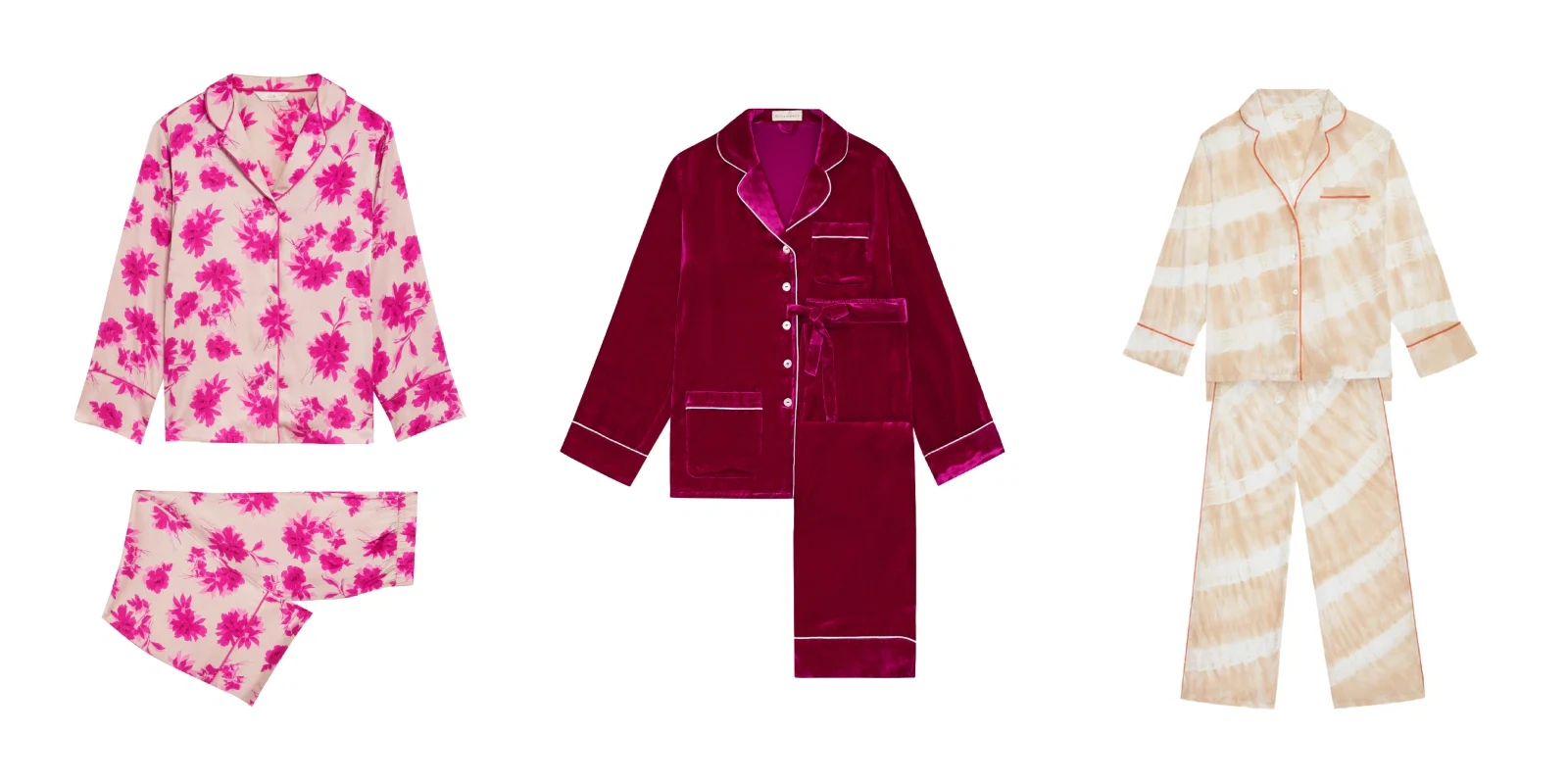 Marks & Spencer Rosie Satin Pyjamas, €50 | Olivia von Halle Coco Berry Silk Velvet Pyjama Set, €595 | Zoë Jordan Sand Positano Pyjamas, €97
