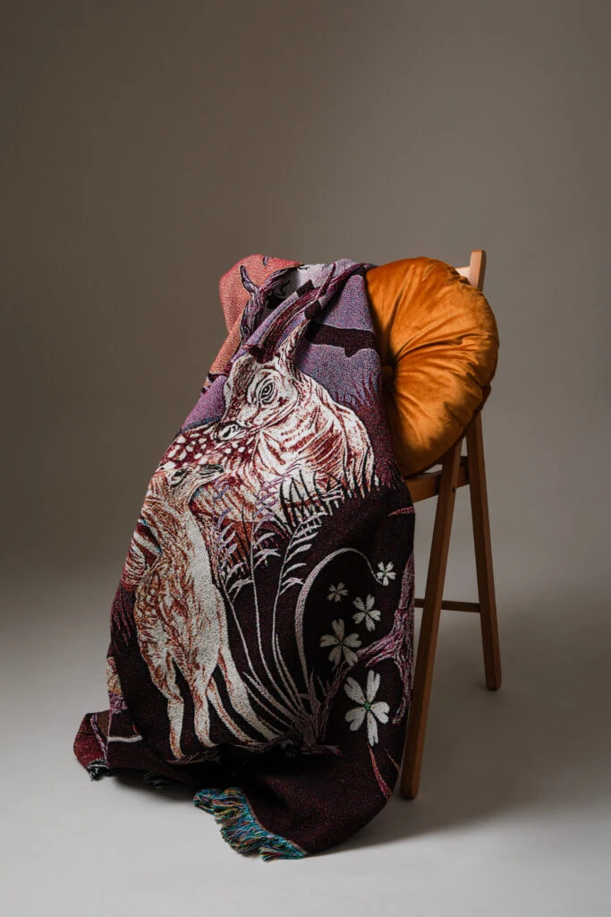 The artwork, featuring a stag protecting its fawn in the Phoenix Park, symbolises the festive family tradition of spotting majestic deer. Committed to sustainability, the blankets are 100% wool, with 70% being recycled, and my textiles are OEKO-TEX® STANDARD 100 certified, ensuring they are free of harmful chemicals. This product launch has been my most successful to date, with 20% of the proceeds directly benefiting the hospital, contributing to a better, caring society.