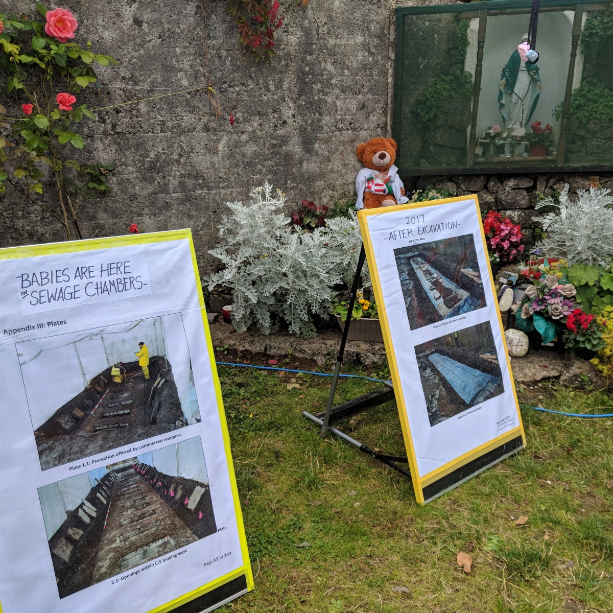 When I first saw the ground of the mass grave at Tuam, where the remains of children were found in sewage chambers, it was through a small hole in hoarding erected for the test excavation. A statue of the Virgin Mary stood in the far corner, overlooking the dark gravel raked over disturbed earth, with spray paint marking certain locations on the surface, presumably left by the technical team.