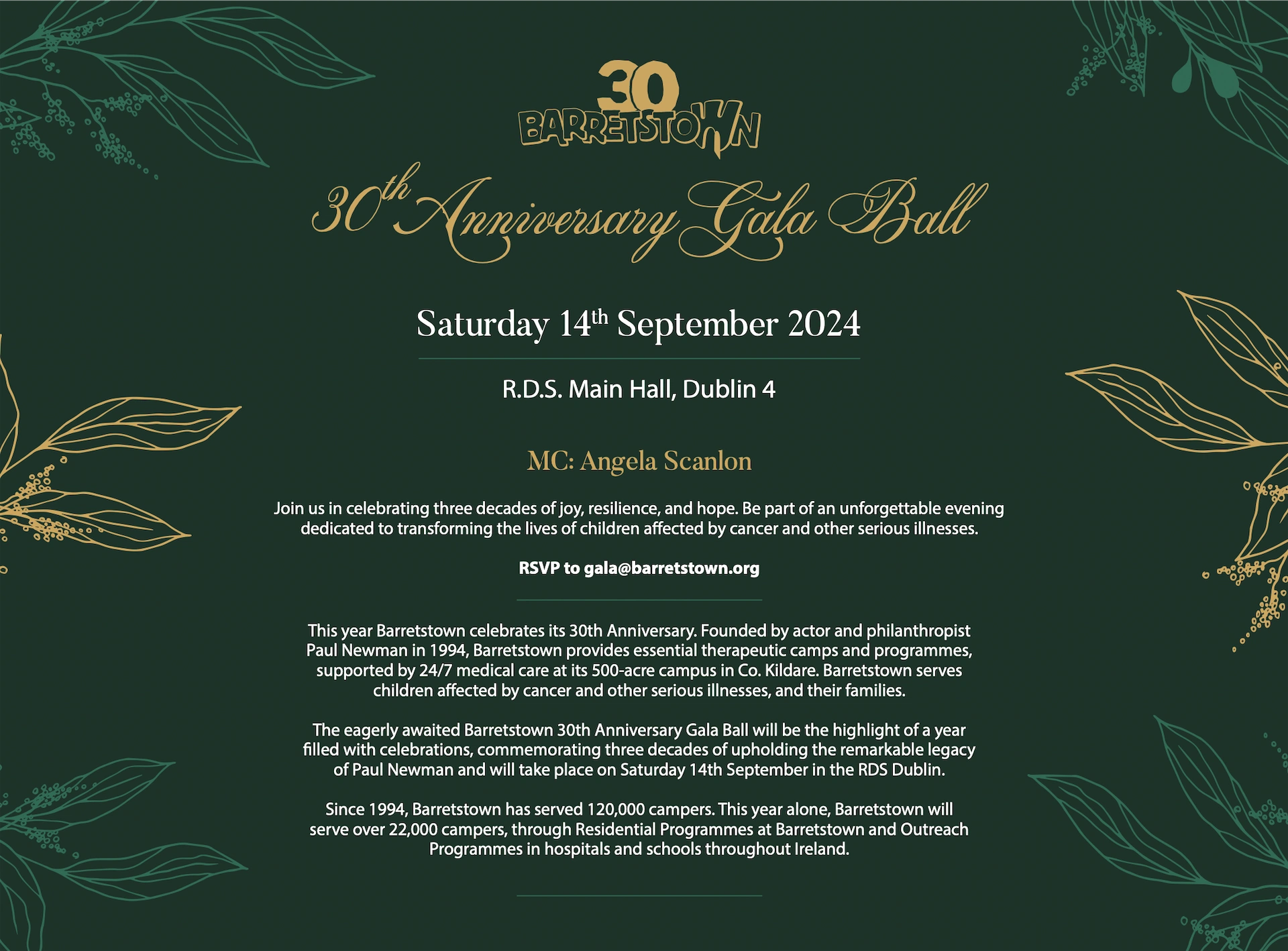Taking place on Saturday, September 14, the celebratory gala will be held in the RDS in Dublin and is expected to be a very fun night out with special entertainment, musical performances and more than a few famous faces. Historically, these gala events have been key fundraisers for Barretstown, drawing significant attendance and support from the community. Angela Scanlon will be on hand to MC.
