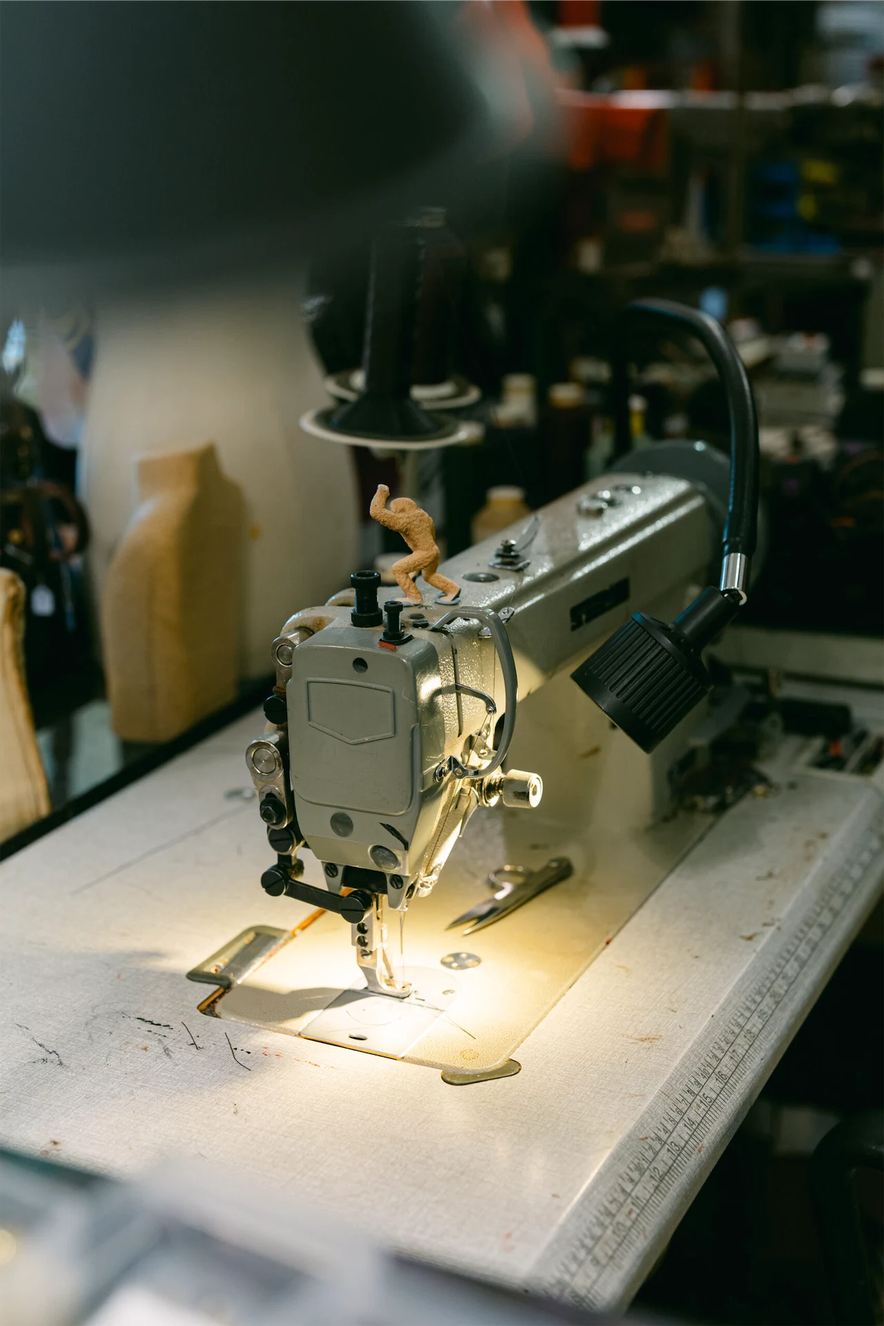 A talented craftsman indeed, Ken’s unique, rich designs are displayed throughout the space, punctuated by spools of thread, bottles of treatments and dyes and other tools of the trade.
