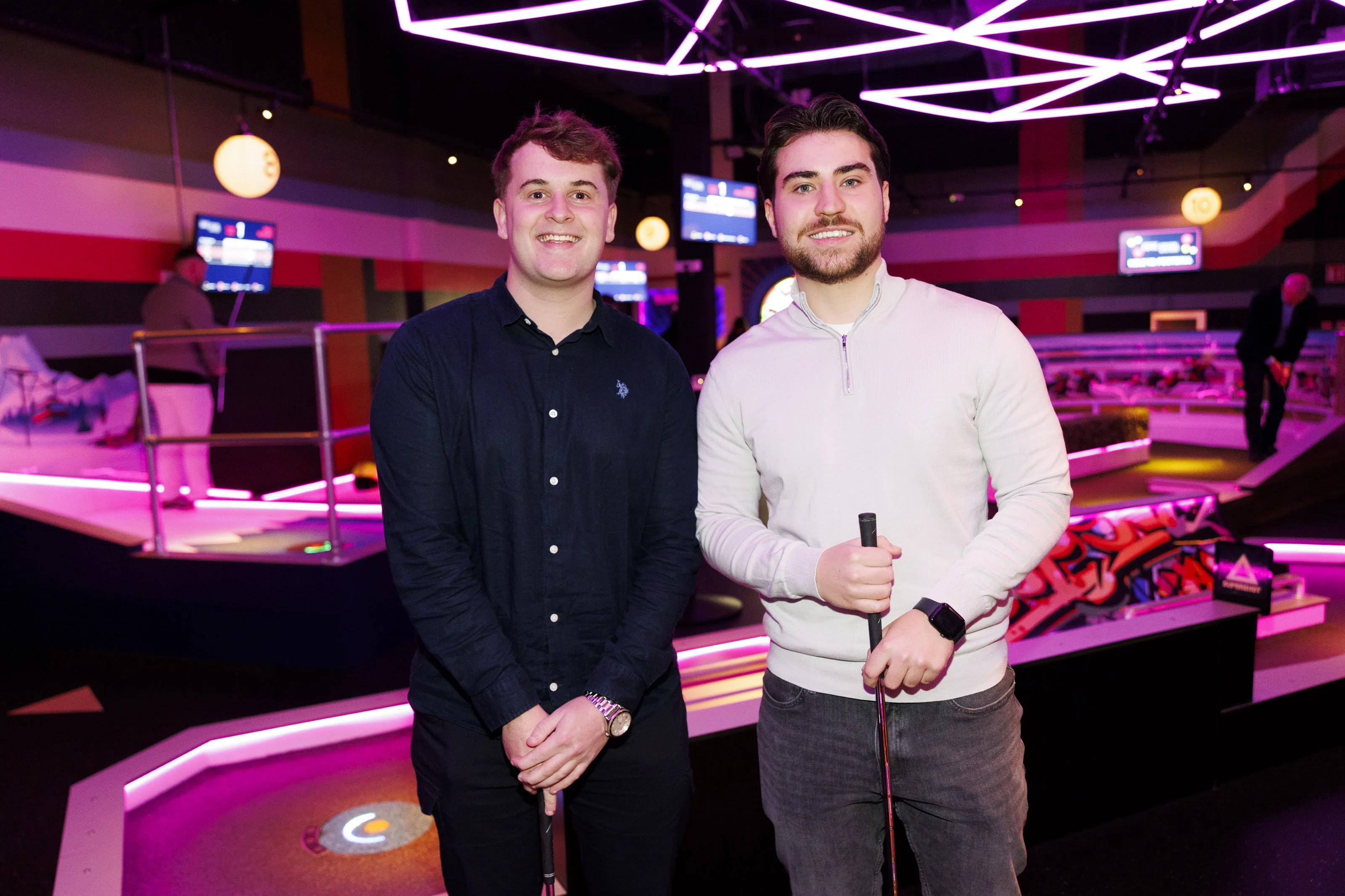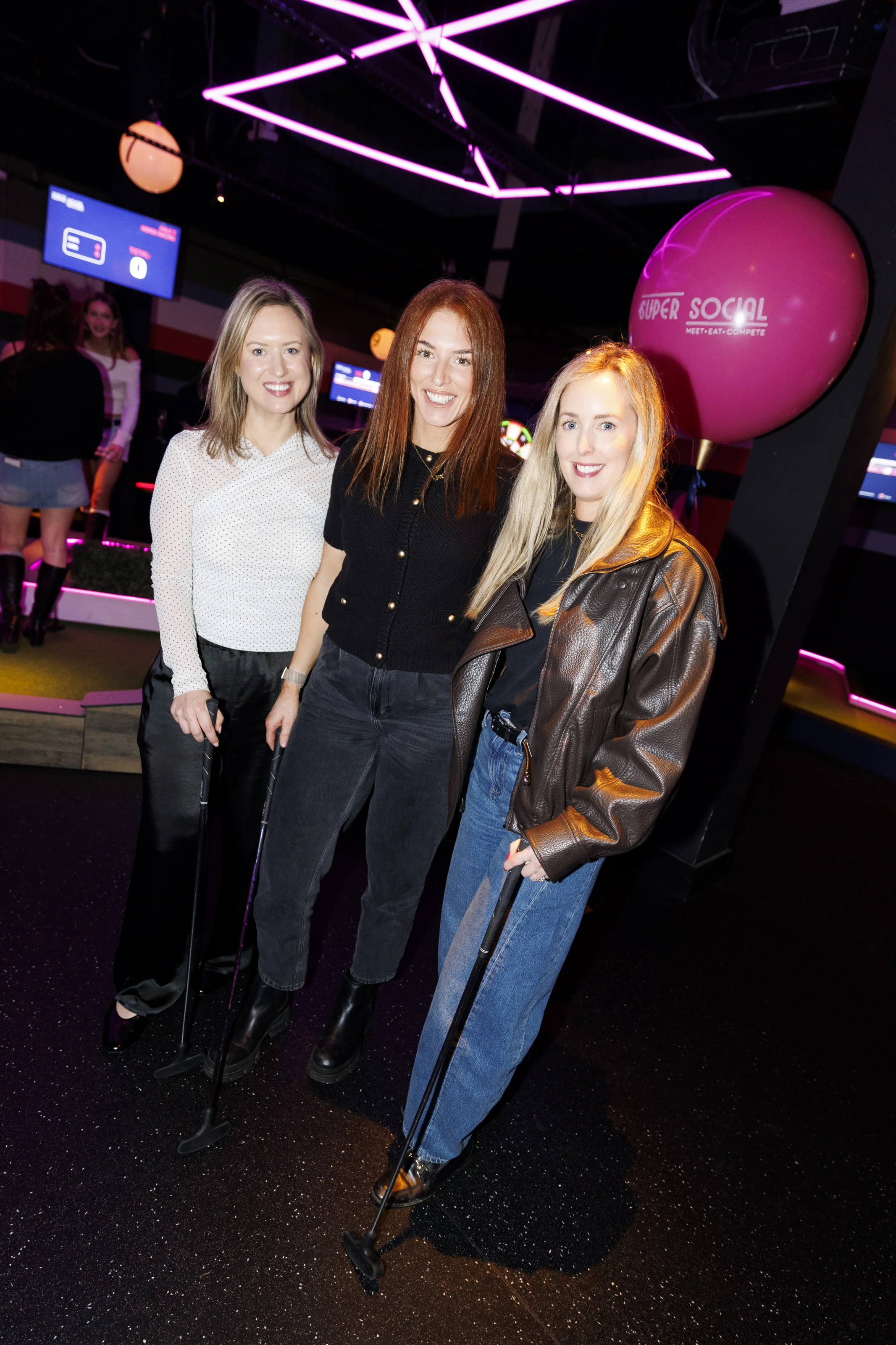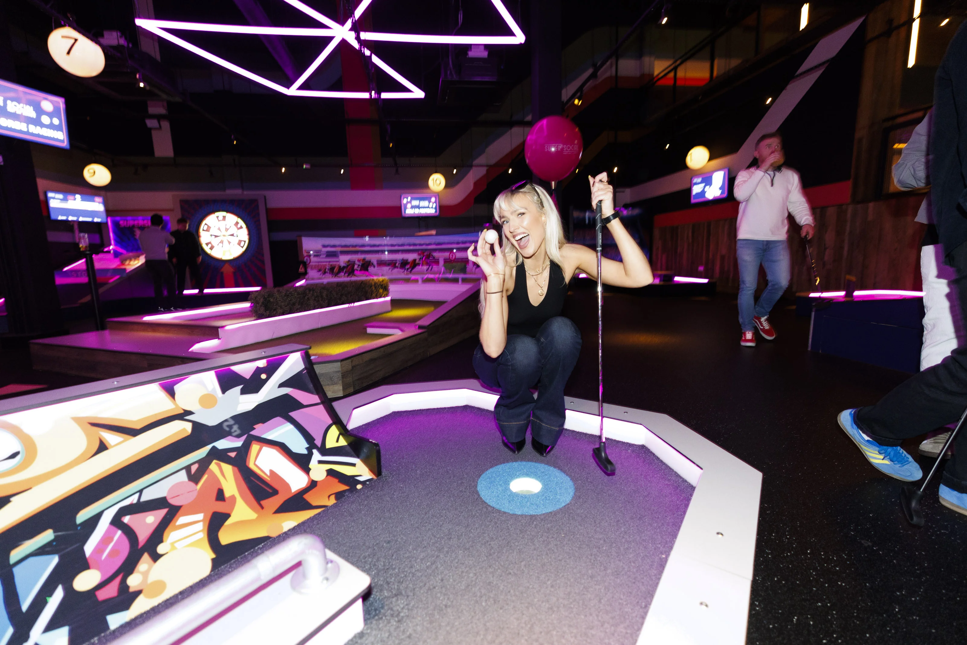Super Social, Leopardstown’s beloved competitive socialising venue, celebrated its first birthday by welcoming a host of familiar faces from the worlds of comedy, social media and entertainment. Attendees had the chance to try their hand at activities such as NxGen Interactive Darts, 12 Holes of Ireland’s Highest-Tech Mini Golf and Supercharged Shuffleboards.
