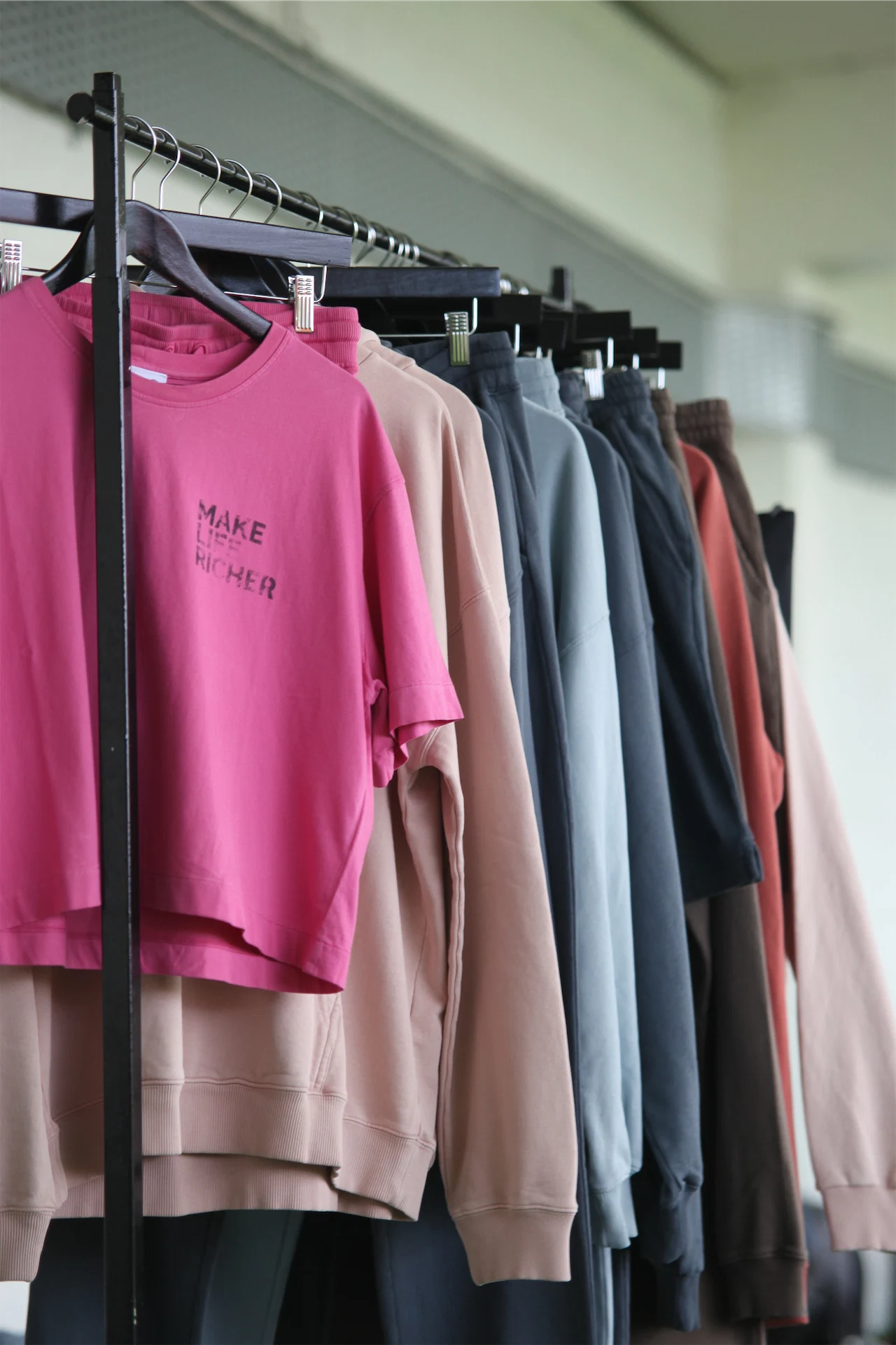 Made up of joggers and sweat shorts, crewnecks and pullovers, the collection’s individual pieces are cut and sewn first, then dyed and washed so the clothing has a vintage, lived-in feel.