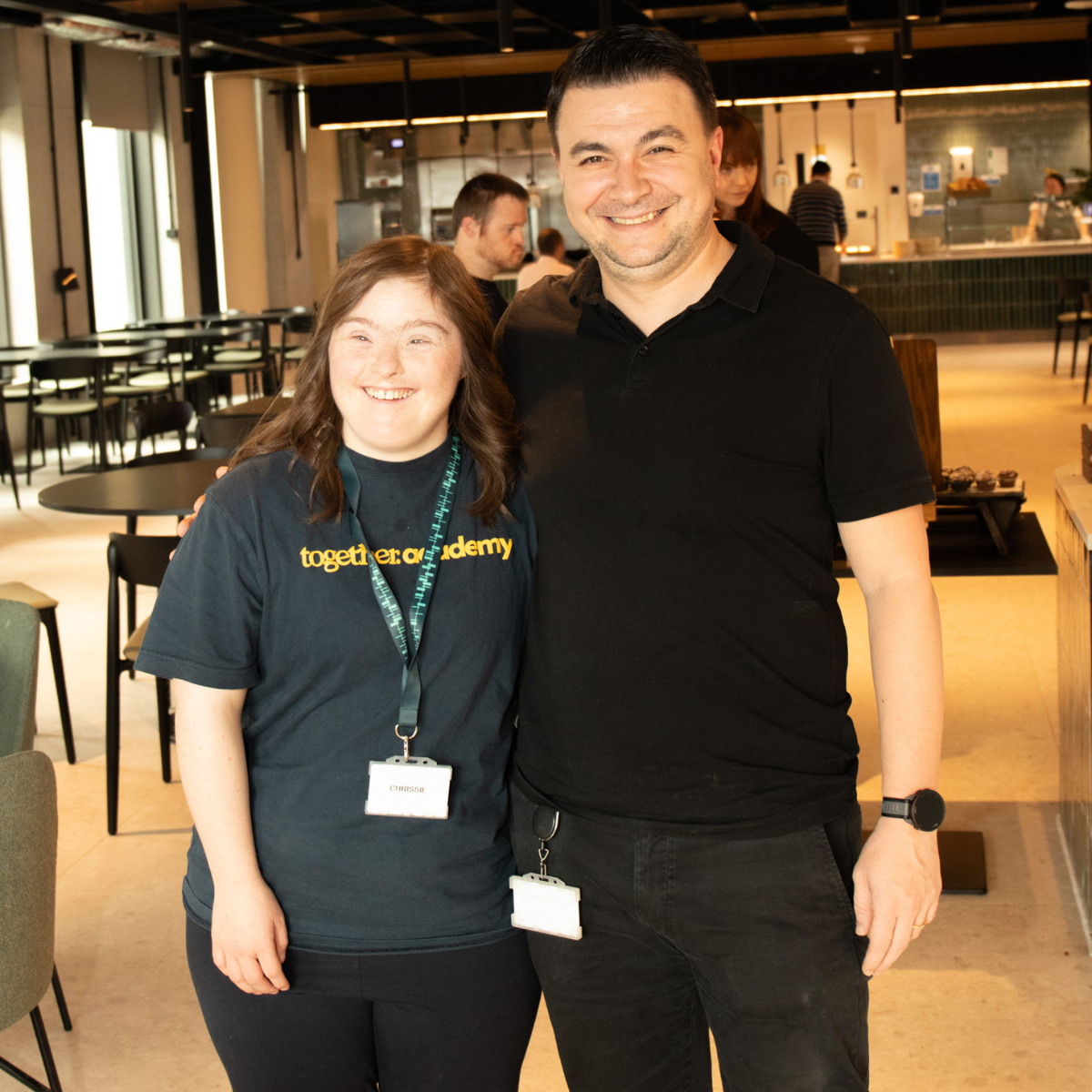 Walking into the new Together Academy Café on the ground floor of the SMBC Aviation Capital building on Fitzwilliam Street (which is open to SMBC Aviation Capital staff, other tenants of Fitzwilliam 28 and invited guests) it’s impossible not to feel your mood lift. The space is a joy – floodlit with daylight and the beaming smiles of the Together Academy young adults buzzing around, making coffees, serving tables, joking with each other.