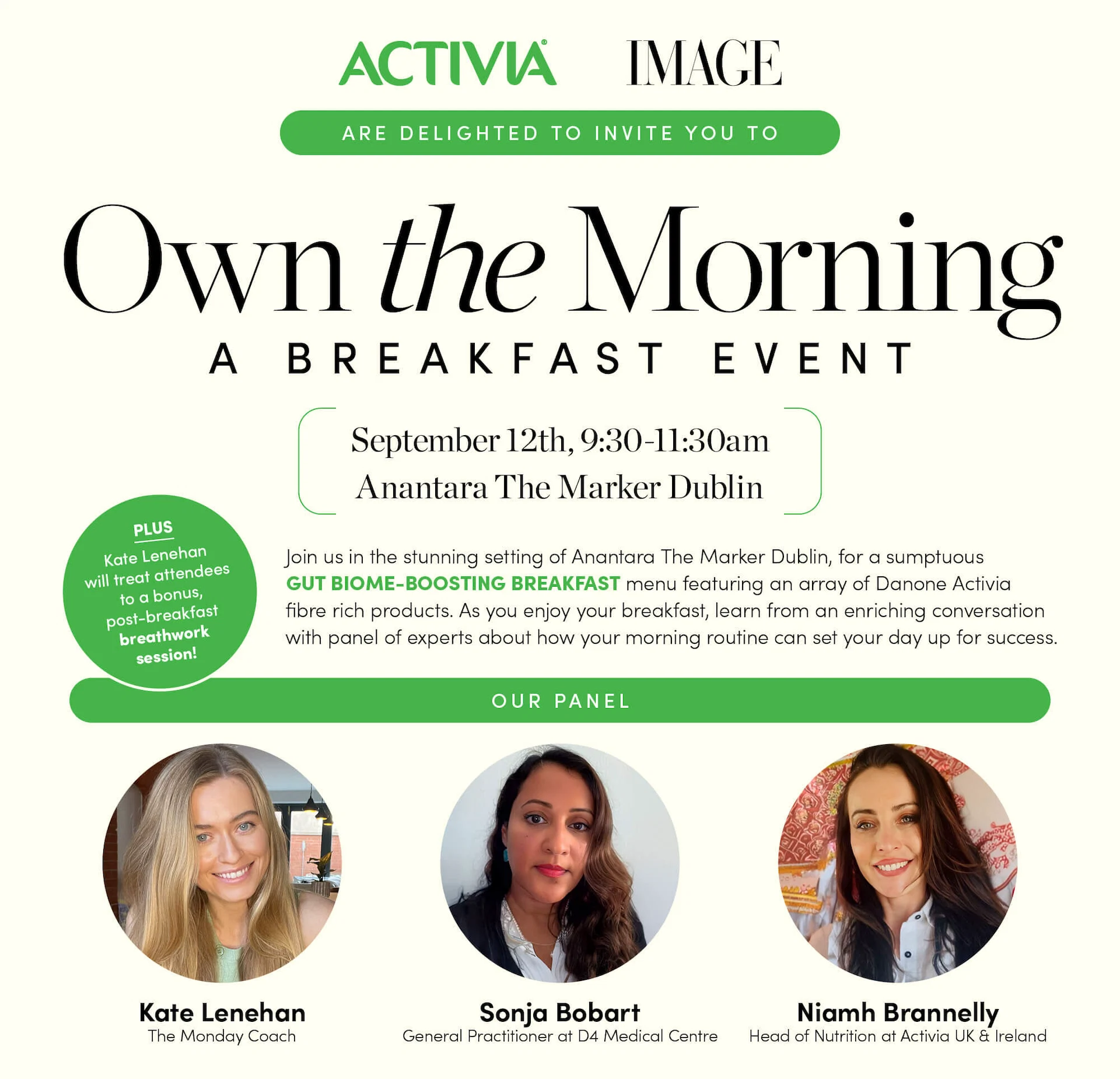 As you enjoy your breakfast, learn from an enriching conversation with a panel of experts about how your morning routine can set your day up for success. Our speakers include health and nutrition coach Kate Lenehan (aka The Monday Coach), GP at D4 Medical Centre Sonja Bobart and Head of Nutrition at Activia UK & Ireland Niamh Brannelly.