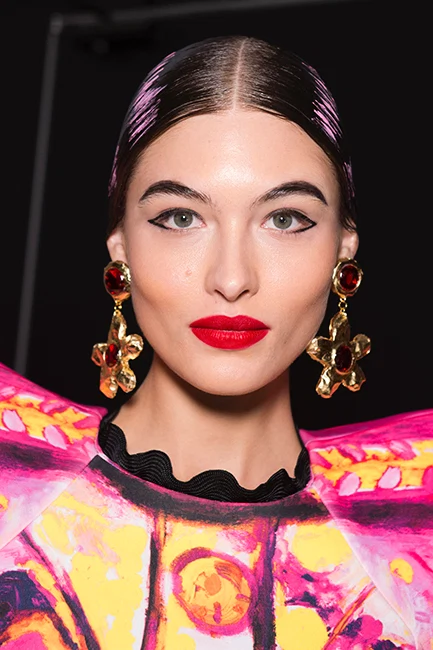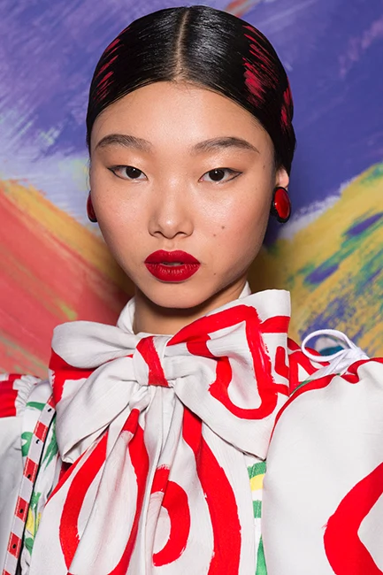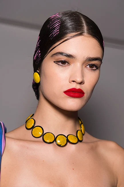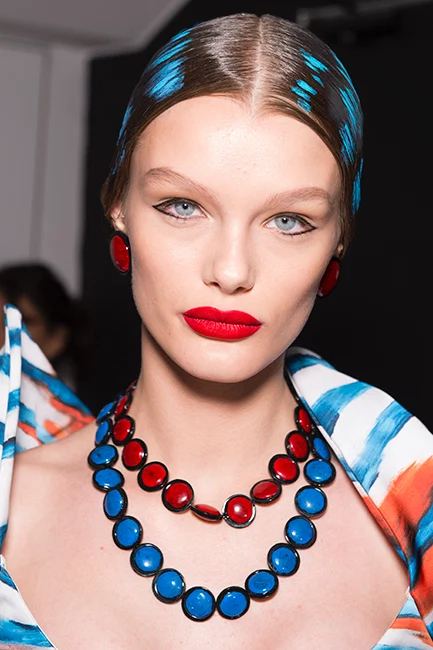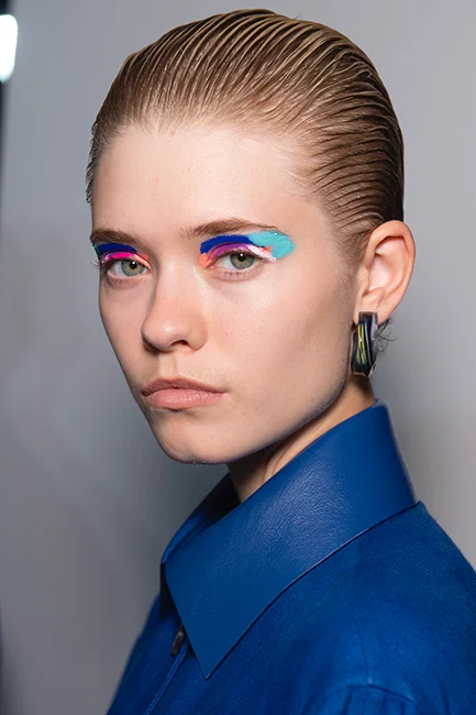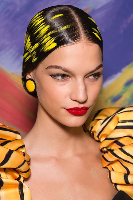 The hair was slicked-back, middle-parted with Pop Art painterly strokes of neon brights painted into the hair, with graphic liner, a Crayola bright red lip and very defined brows – no doubt, our favourite look of the week.