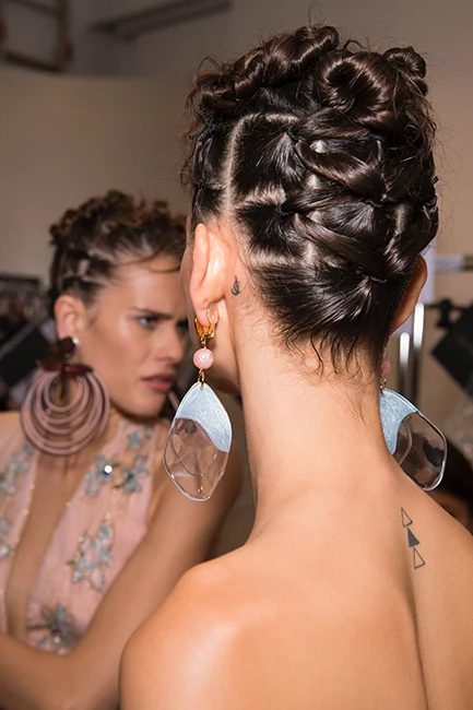 At Armani and Fendi we saw intricate and elaborate buns in very different iterations – Armani’s was sleek, where at Fendi, eyeliner was worn on the inner eye like when you were fourteen and paired with messy hair that made everyone look a bit hungover. Moschino, of course, is never to be beaten when it comes to a headline-grabbing beauty look.