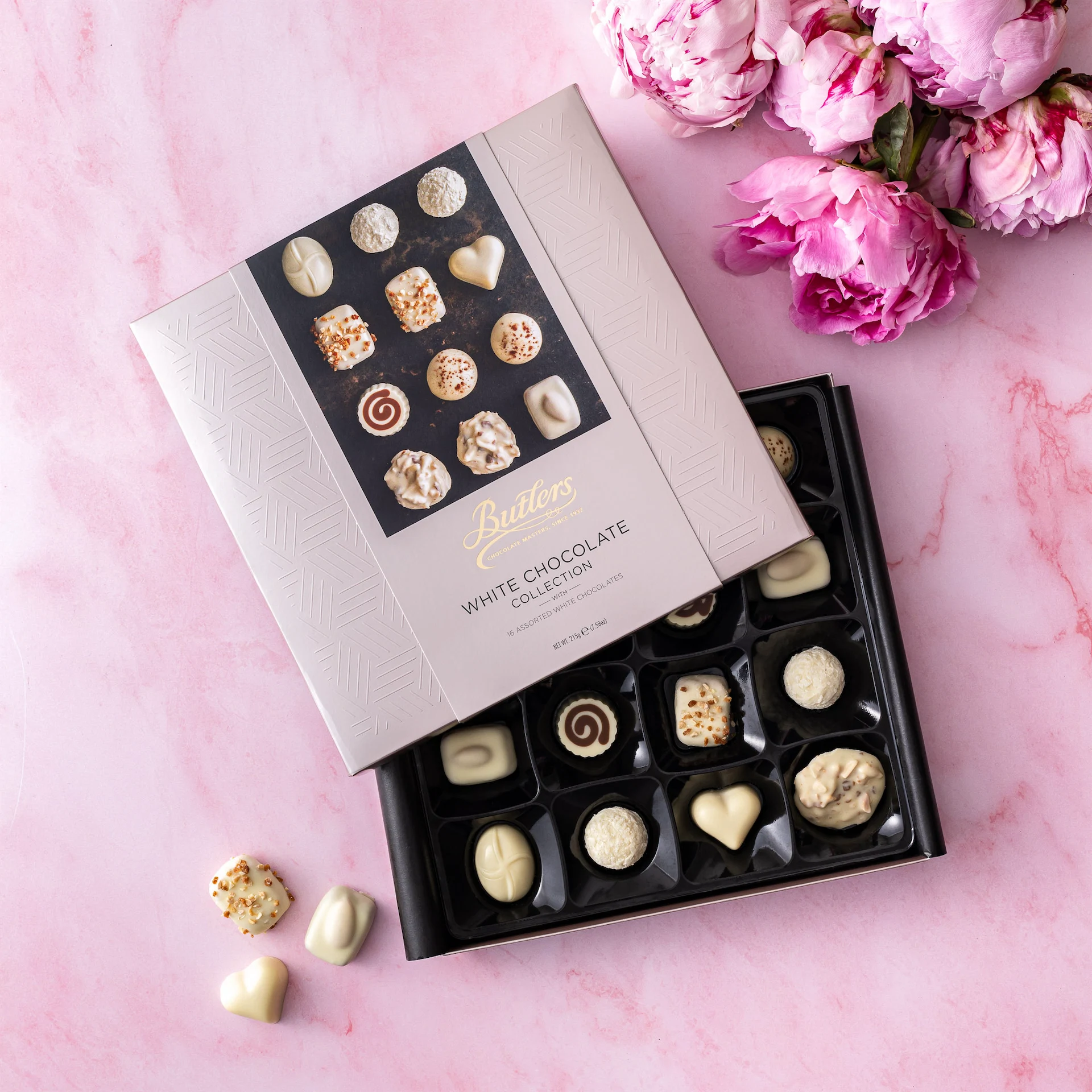 When you lift the lid on this brand-new collection from the master chocolatiers at Butlers, expect to discover a decadently smooth and exquisite white chocolate experience. The sophisticated collection of 16 mellow, velvety white chocolates includes Butlers Chocolate Café customer favourites such as White Chocolate Flake, Almond Café, Vanilla and Latte.