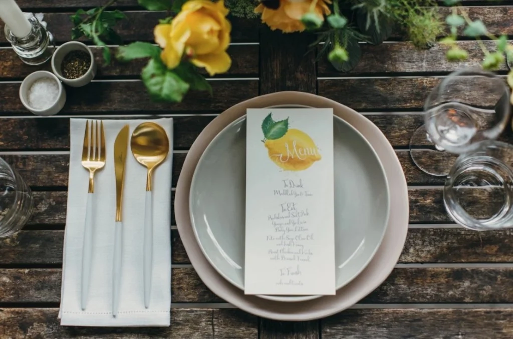Paper goods are the perfect medium for bringing bright, summery motifs through to your tablescape; stationery will never look awkward, whatever kind of day it is. Reflect the pops of colour you use in your florals in a papery theme that guests will notice here and there, on menus, signage and namecards.