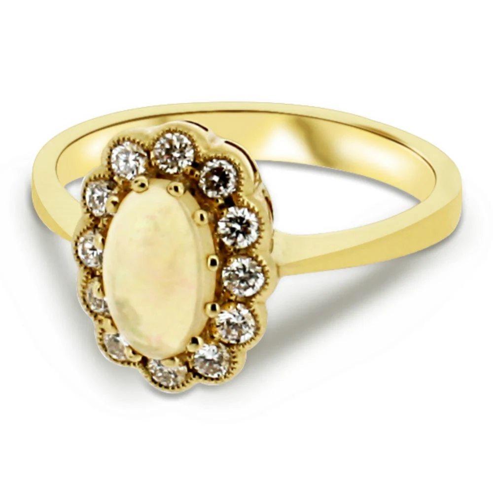 18ct yellow gold opal and diamond-surround vintage engagement ring, €1,950 from Lorimat