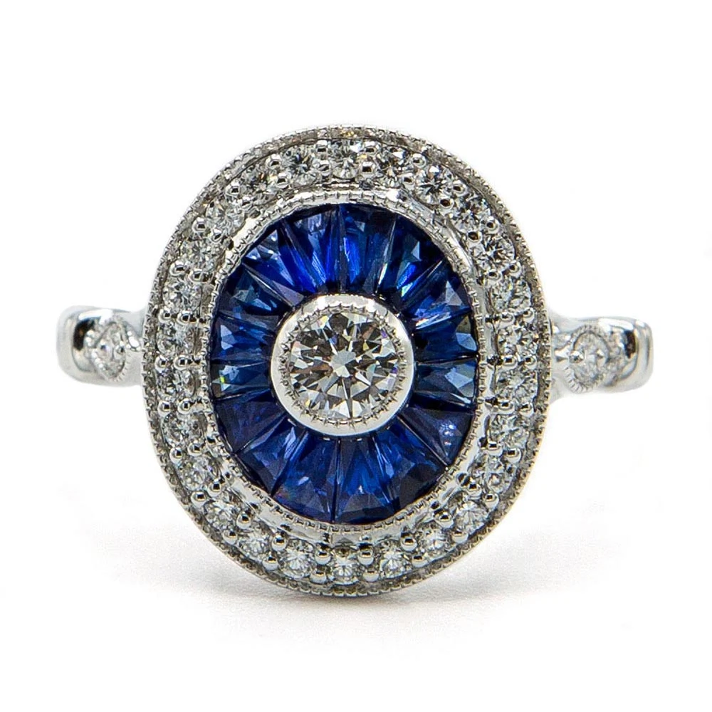 18ct white gold, 1.45ct baguette cut sapphires, 0.41ct round brilliant cut diamonds vintage engagement ring, €3,950 from Lorimat