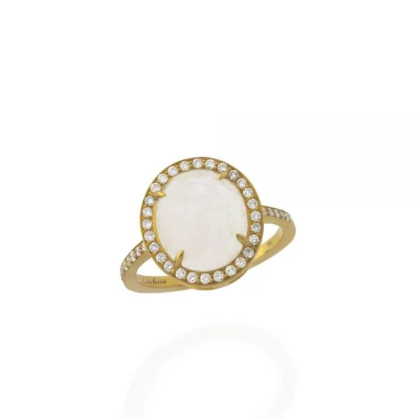 Oval rainbow moonstone in 18K gold with pave diamonds ring, €3,449 from Loulerie