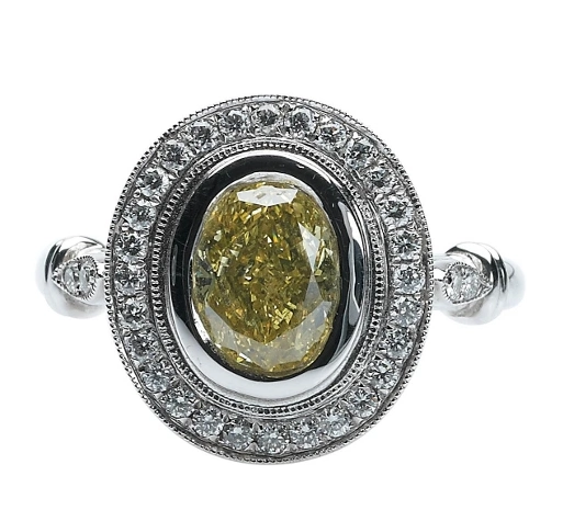 Oval cut yellow diamond with white diamond halo & diamond shoulders Enya dress ring, €7950 from Rocks Jewellers