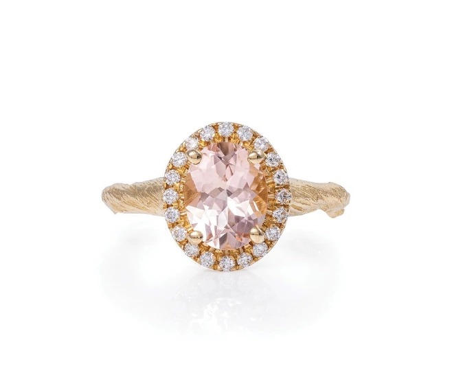 Solid gold ‘Queen of Hearts’ morganite oval halo ring, €5,479 from Chupi
