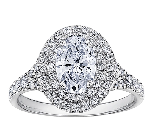 18k white gold oval cut diamond with a double halo and diamond shoulders Eve engagement ring, €2795 from Rocks Jewellers