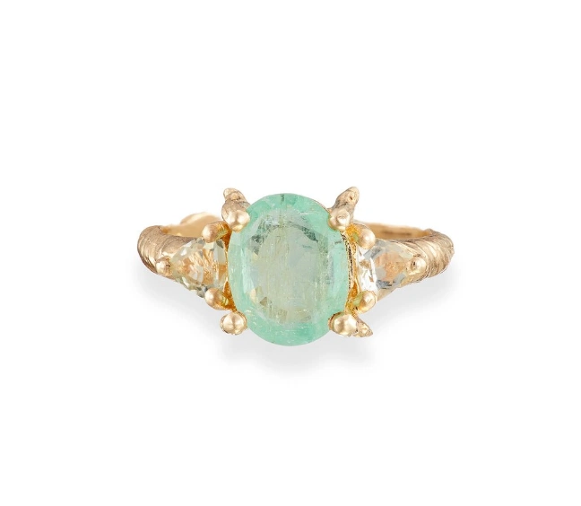 Solid gold ‘One in a Trillion’ Russian emerald & prasiolite ring, €2,379 from Chupi