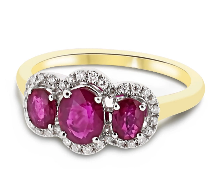18ct yellow gold oval cut ruby and diamond halo vintage engagement ring, €2,200 from Lorimat