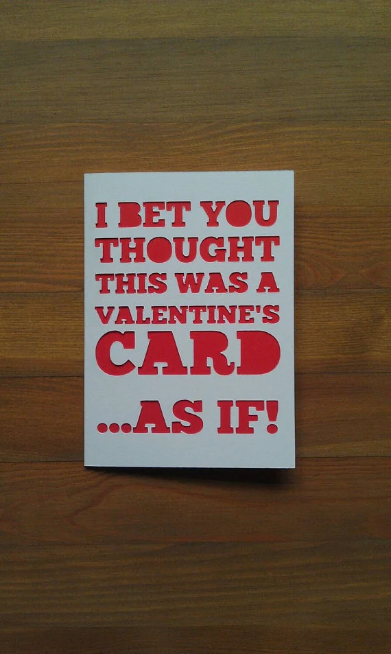 However, like Christmas, Valentine’s Day is just another spot in the calendar where the sentiment behind the celebration has been bastardized for commercial gain. Yet you must take part in the festival of consumerism, so here are some alternative valentine cards to buy your significant other in an anti-establishment way, or if you are a hilarious person.
