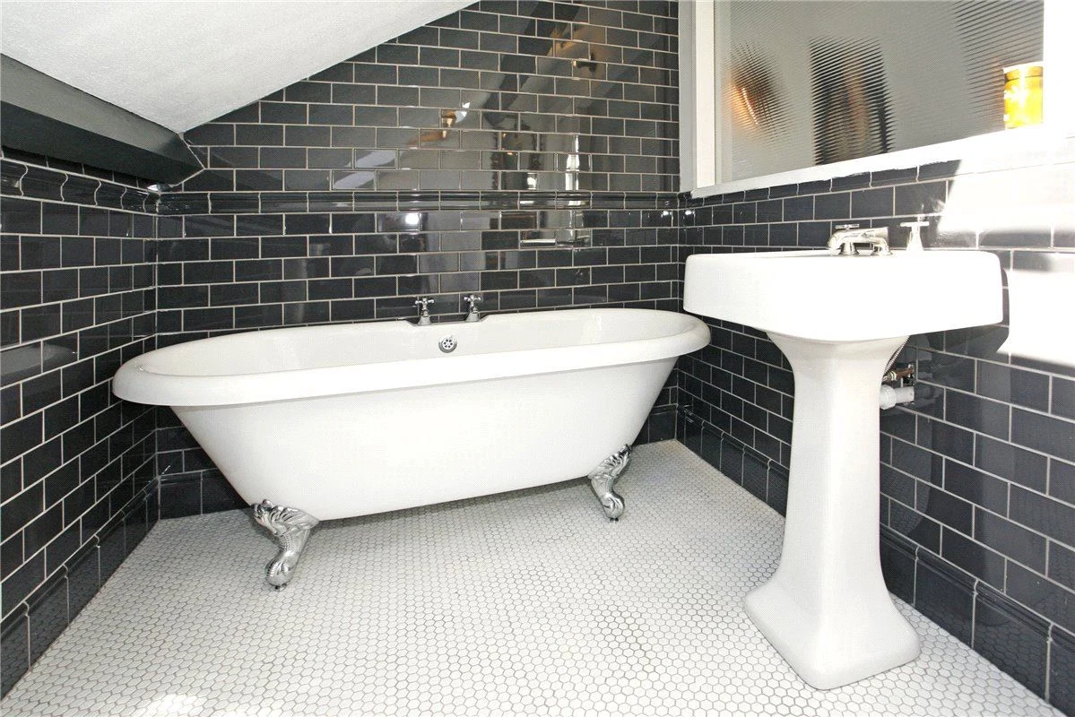 Three of the bedrooms are located on the first floor, as well as plenty of storage and wardrobe space. There is also a family bathroom, which is fully fitted with a free-standing bath, a separate walk-in shower, WC, and black subway tiling.