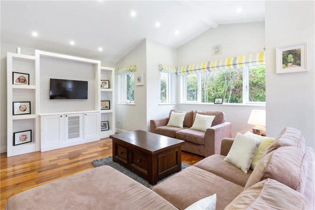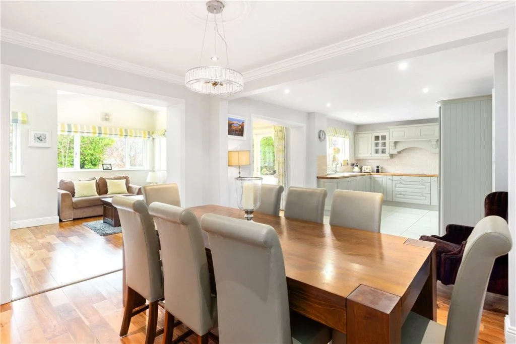 This kitchen merges effortlessly with the dining area (which currently has an eight-seater dining table), and this in turn flows into the bright, rear family room.
