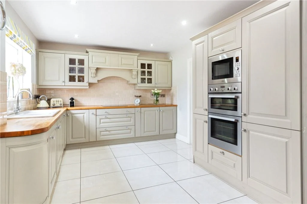 Notable features here include an extensive range of storage units, wooden countertops, tiled splashback and under-unit lighting. There are also a number of mod-cons, including an integrated Zanussi double oven, a Beko fridge, hob and extractor fan, as well as a Belling microwave.
