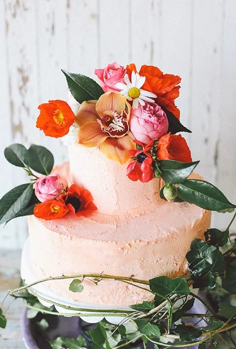 Be bold in your interpretation of a spring wedding cake and embrace colour