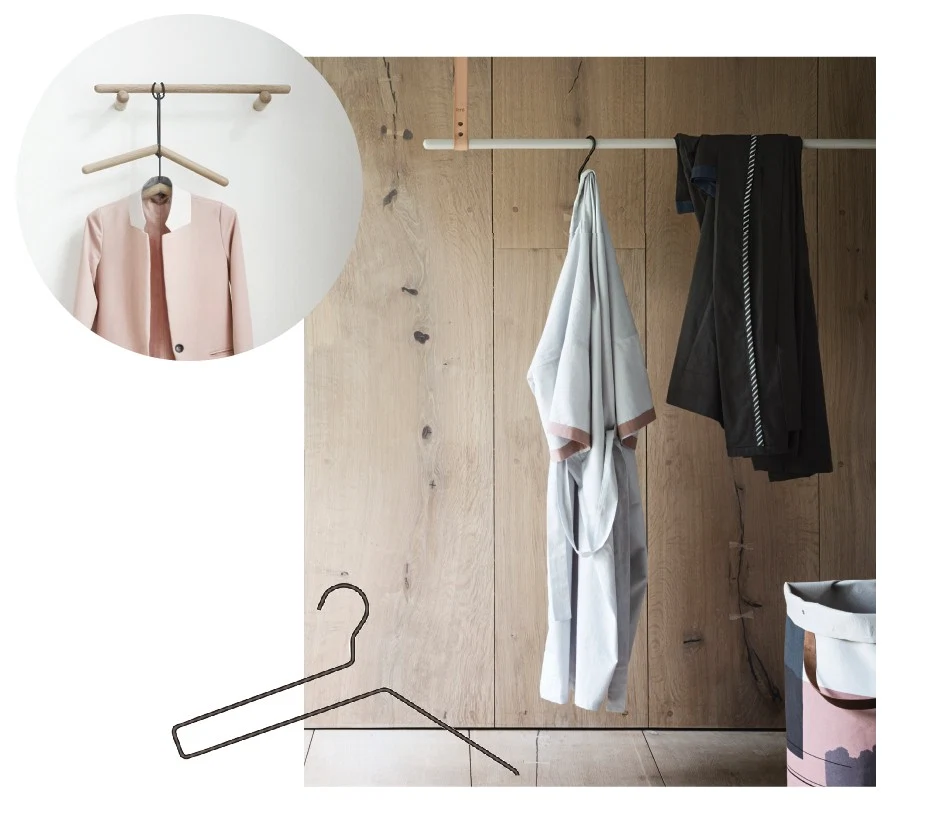 FIVE Space in a utility is usually at a premium, so create room with storage that uses little to no floor space. This hanging clothes rail from Ferm Living (below, right) doesn’t need walls and maximises otherwise underused space. While having these elegant Georg hangers from Finnish Design Shop and The Organised Home on display will encourage immediate hanging up, which also minimises wrinkles.