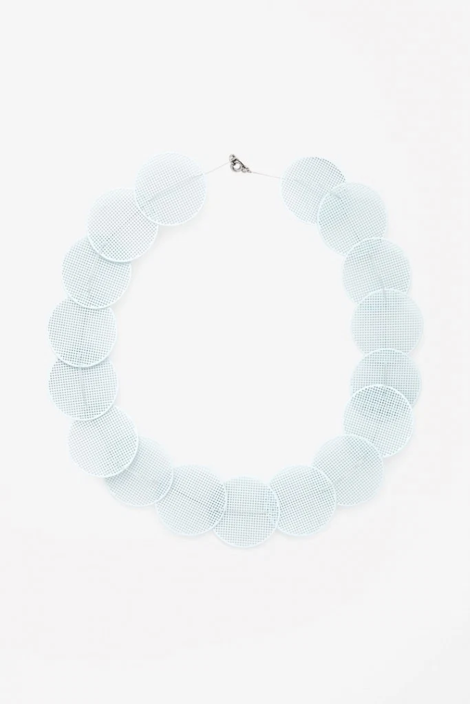 This little necklace is from COS. It’s delicate but the blue metal discs?give it a bit of a kick.