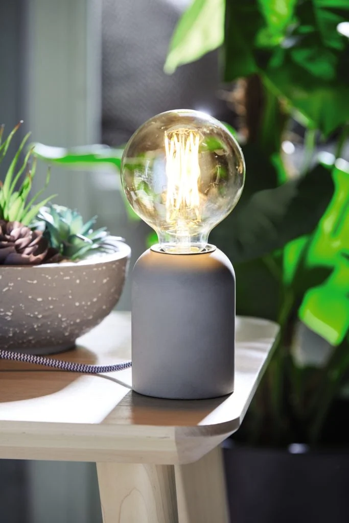 Add a glimmer of style with this smooth concrete-esque lamp, which includes an exposed vintage style Edison bulb. Perfect for brightening up any room and reflecting all those patterns and textures.