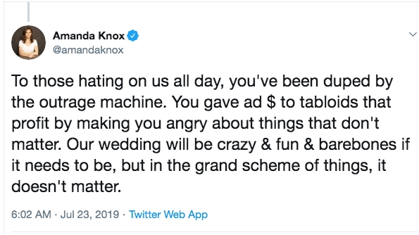 “I have a lot of haters in this world but I have a lot of family friends and supporters as well. I wanted to share with them this fun, creative idea.” Knox insists there was a mix-up; the narrative twisted by the press and that they were simply asking their family and friends to donate to the cost of the wedding in lieu of buying them presents.