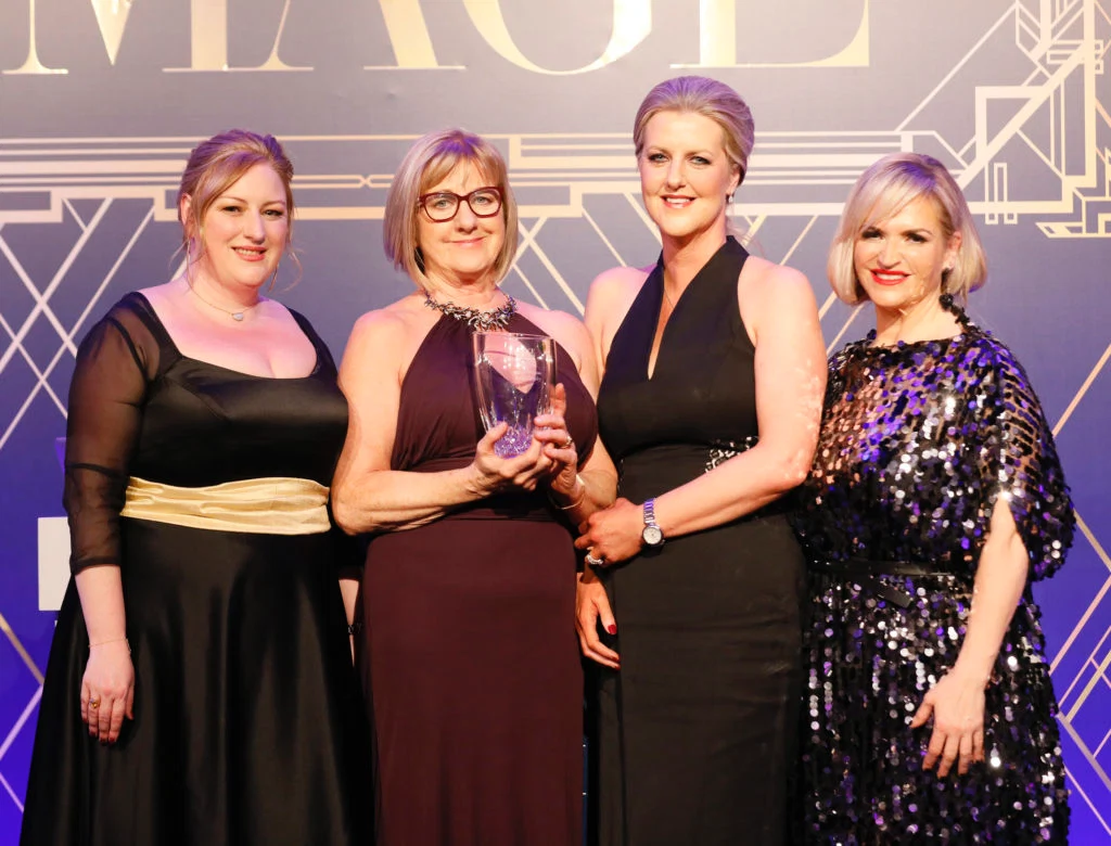 Breda Quigley accepting her award for CEO of the Year, pictured with Dearbhail McDonald, Pamela Quinn, and Melanie Morris; photo by Kieran Harnett