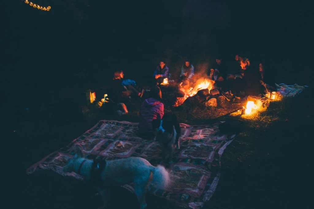 We squeal with delight when we arrive to the spot where we will be camping for the night; a grassy area has been filled with an assortment of tents alongside a dreamy campfire which comes complete with patchwork blankets and twinkling fairy lights in the surrounding trees – it’s like a scene out of a quirky Wes Anderson camping movie.
