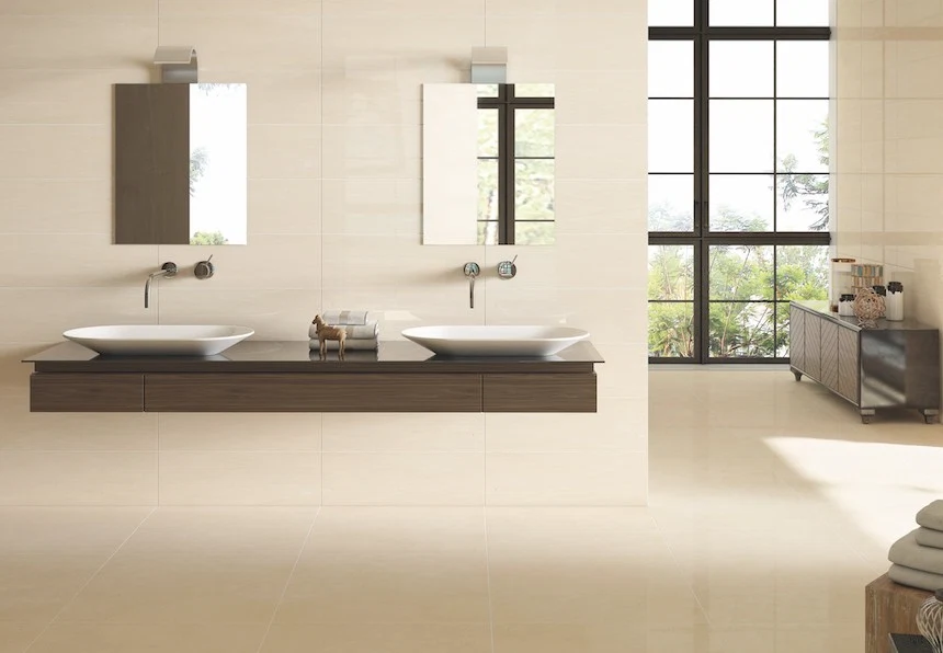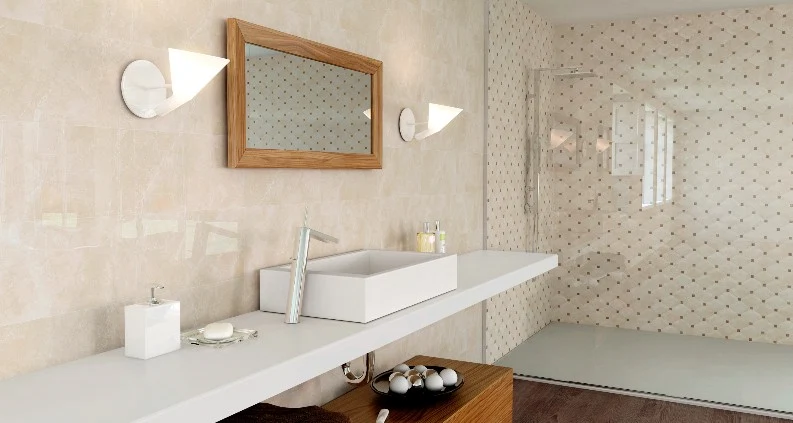 This collection is perfect if you want to go all-out luxury in your bathroom. The Adua tiles are a beautiful soft cream, is a glossy finish and cut in an elegant 250x400mm size, or in the elongated 250x750mm tile, featured above. This will draw the eye around your bathroom and give the impression of space, particularly with the matching floor tiles, which makes it ideal for a small bathroom.