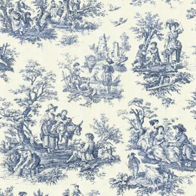 Although Toile de Jouy literally’means?”fabric from Jouy-en-Josas”???a southern suburb of Paris???it was in fact designed in 1752 by printer Francis Nixon in Drumcondra, Dublin. It was subsequently hugely?popular all over Europe, particularly in Britain and France, as its amendable pattern allowed for any number of leisure activities of the upper classes to be captured such as picnicking, dancing, and even hot-air ballooning.