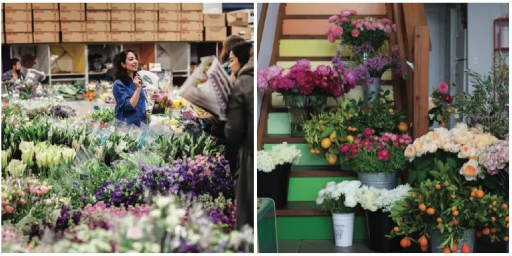 The sun is barely peeking out over the horizon. Cars whizz by, their lights bright against a dusky sky. Bleary eyed, I stand in what looks like a car park surrounded by low, industrial, unremarkable buildings. This is the life of a floral designer. It’s 7am, and I’m at the San Francisco flower mart to meet Kiana Underwood, possibly one of the most-beloved floral designers on Instagram. Her designs are distinctive, recognised by their lush, loose, asymmetric arrangements and unexpected colour combinations. In the short five years since she started, her work has featured in international bridal publications and some of the most popular design and wedding blogs. And it all starts here, with an early morning at the flower mart.