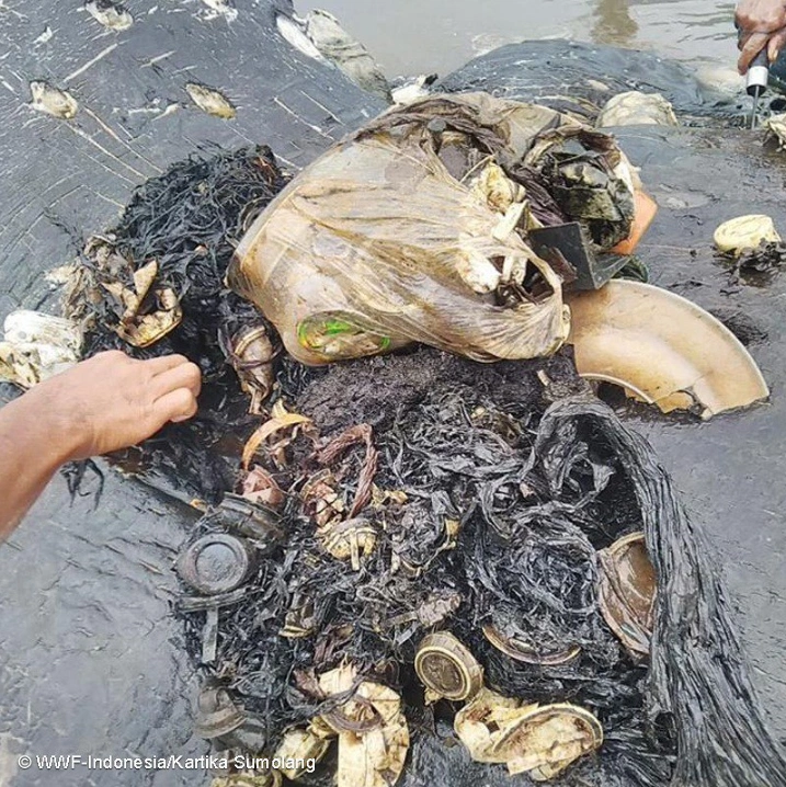The 9.5-metre long animal was found on the shore of Wakatobi National Park with 115 plastic cups, four plastic bottles, 25 plastic bags, two flip-flops, a nylon sack, and more than 1,000 other plastic pieces in its belly.
