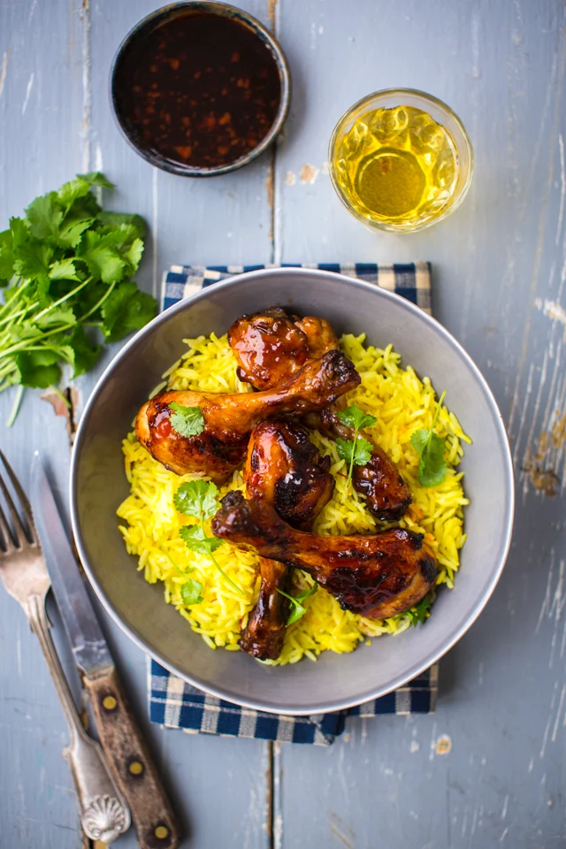 “A dark and heady marinade made with basic kitchen staples. Ideal for any meat, but in this recipe, particularly delicious when used to infuse chicken drumsticks. Served with electric yellow saffron rice.”
