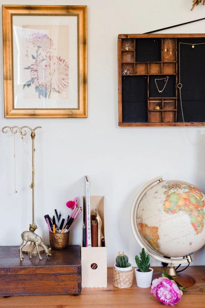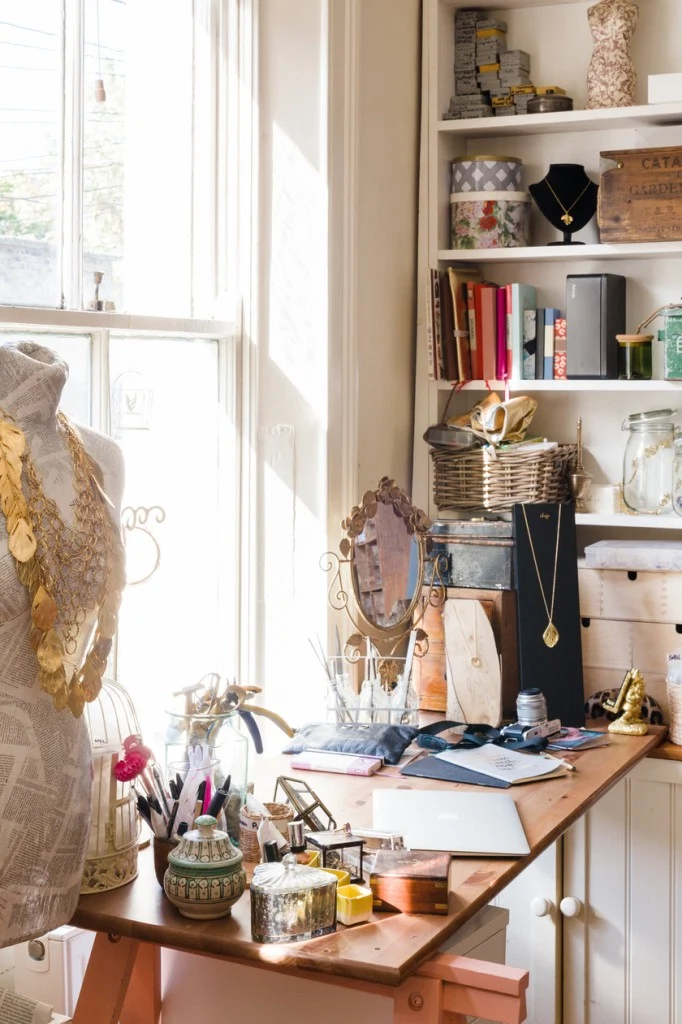 Like her jewellery, Chupi Sweetman-Durney sparkles, and this warmth and charm is reflected in the tiny studio she occupies on the first floor of her period Portobello home. “So many workspaces are cold and grim,” she remarks, “but I wanted to create somewhere warm and inviting instead.” The small but perfectly formed space is peppered with pretty trinkets from Sweetman- Durney’s sourcing trips abroad – as well as her honeymoon to Japan – found objects, and homely textiles, such as sheepskin throws and red gingham seat cushions, of which her two terriers, Poppy and Rufus, have made makeshift daybeds.