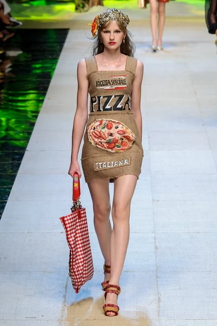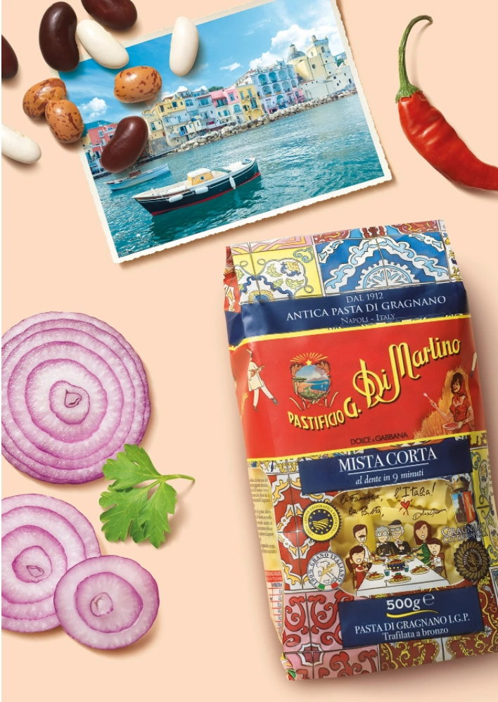 The house collaborated with expert Italian pasta makers Pasta Di Martino to create a special edition pasta in a range of colours, symbols and monuments identifiable to traditional Italy. The product remains strictly the produce of Pasta Di Martino: bags of spaghetti, paccheri, and penne mezzani rigate, all adorned with whimsical designs of famous Italian landmarks like the Milan Duomo, a Venice canal, the Colosseum, and the Leaning Tower of Pisa. The packaging and design was forefronted by D&G, and feature an Italian woman in traditional garb (D&G, no less); an image synonymous with the iconic Italian brand.