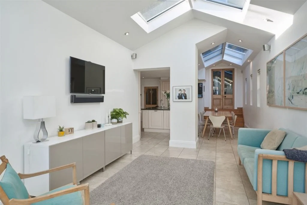 Designed by Tyler Owens Architects, the open plan extension spans the entire width of the house and incorporates a living room, dining area and kitchen. The high vaulted ceiling features multiple skylights, while glazed panels overlook the rear garden. Not only is this a sunny and informal room for daytime living, but it is also an impressive space for evening entertaining.
